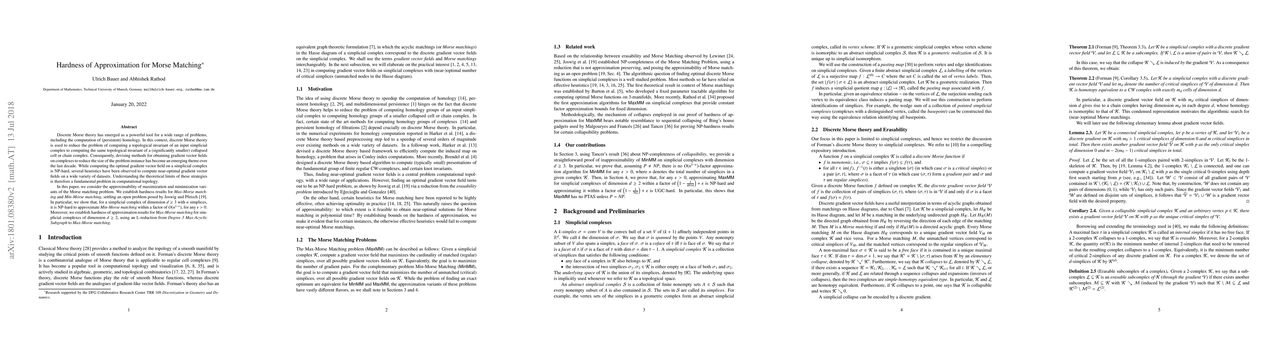 This paper investigates the computational complexity of approximating Morse matching problems in discrete Morse theory, demonstrating that both maximization and minimization variants are NP-hard to approximate within certain factors. Specifically, it proves NP-hardness for Min-Morse matching and establishes both NP-hardness and UGC-hardness for Max-Morse matching in low-dimensional complexes.