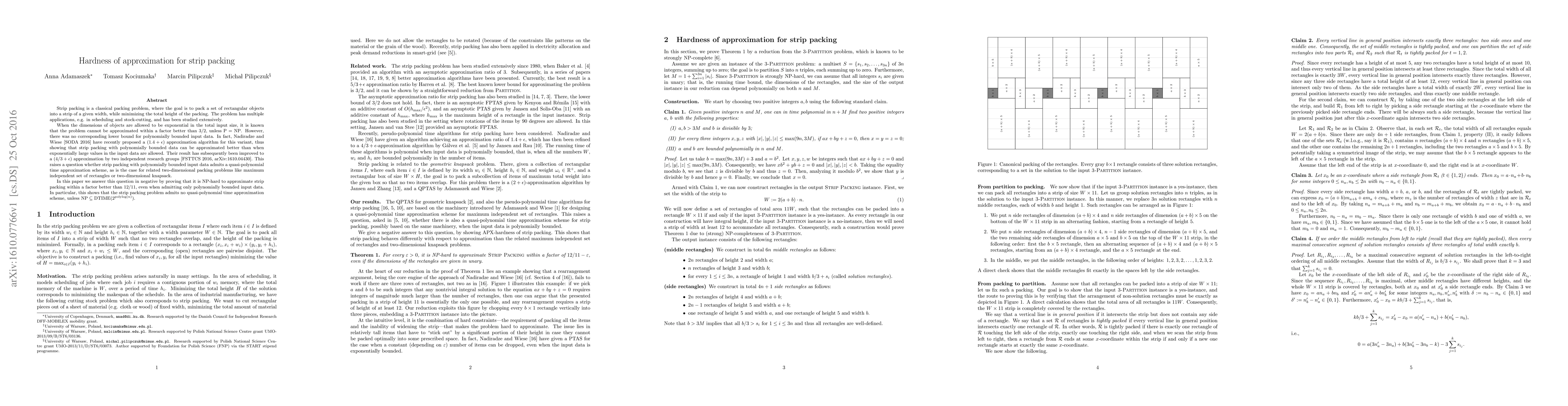 This paper proves that it is NP-hard to approximate strip packing within a factor better than $12/11$, even for inputs with polynomially bounded dimensions. This result indicates that no quasi-polynomial time approximation scheme exists for strip packing unless NP problems can be solved in sub-exponential time.