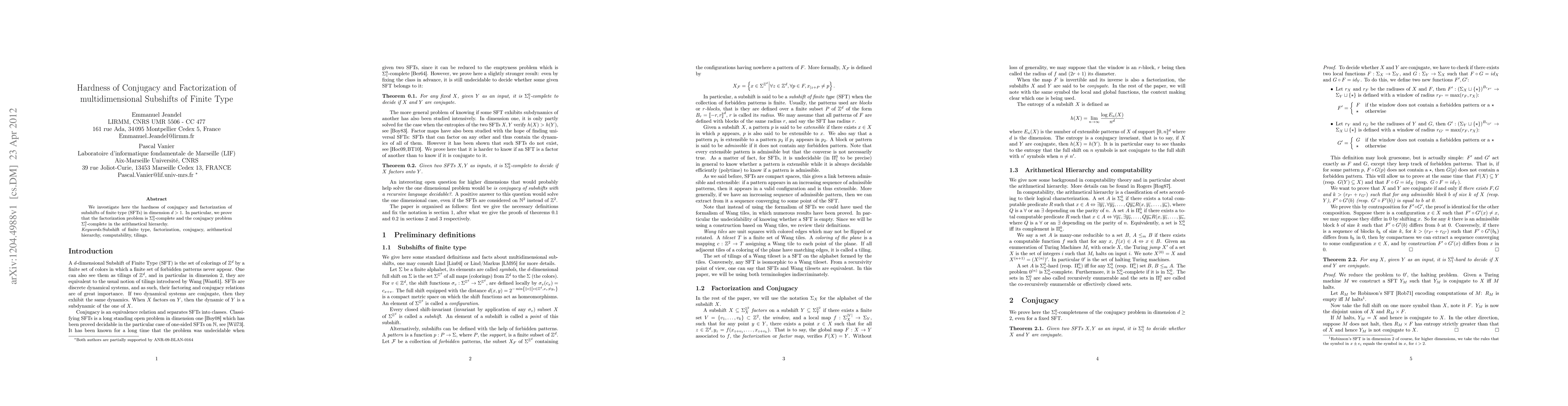 We investigate here the hardness of conjugacy and factorization of subshifts of finite type (SFTs) in dimension $d>1$. In particular, we prove that the factorization problem is $\Sigma^0_3$-complete and the conjugacy problem $\Sigma^0_1$-complete in the arithmetical hierarchy.