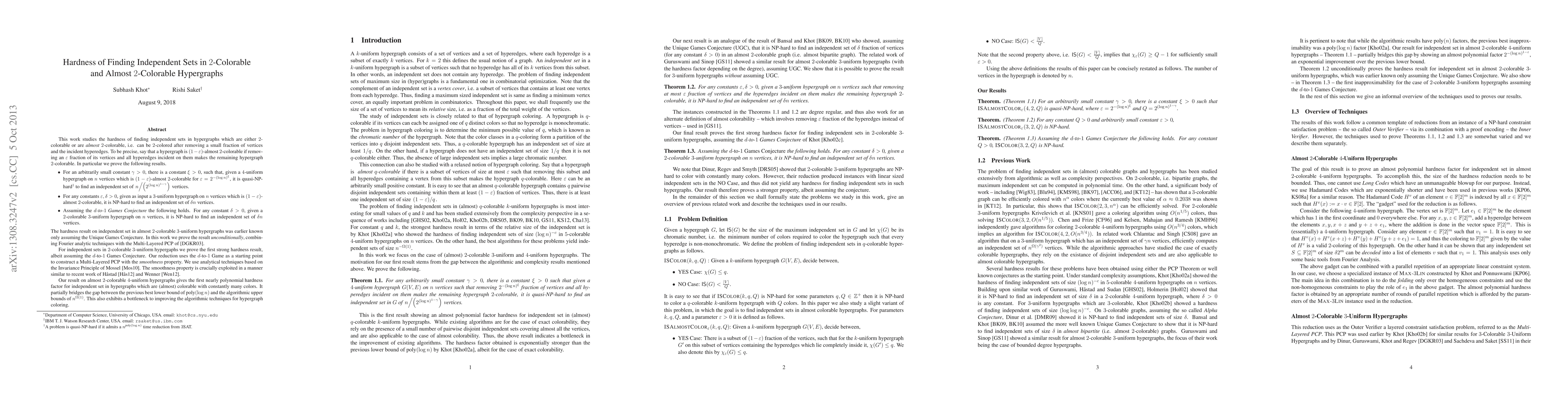 This paper investigates the computational difficulty of finding independent sets in hypergraphs that are either 2-colorable or almost 2-colorable. It proves quasi-NP-hardness and NP-hardness results for finding large independent sets in almost 2-colorable hypergraphs, providing the first nearly polynomial hardness factor for certain cases.