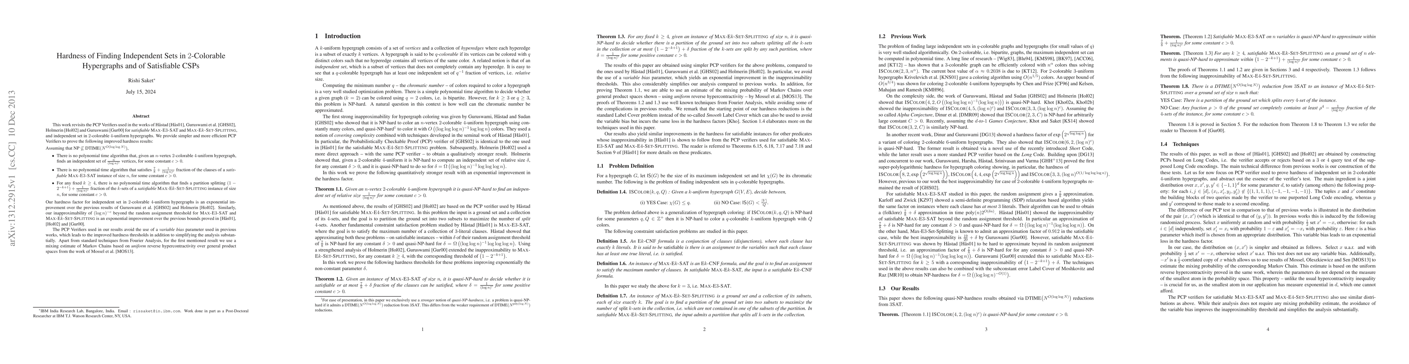This paper presents improved hardness results for finding independent sets in 2-colorable 4-uniform hypergraphs and for satisfiable CSPs using simpler and more efficient PCP Verifiers. The results show exponential improvements over previous bounds, notably avoiding variable bias parameters and utilizing advanced mixing estimates from Markov Chains.