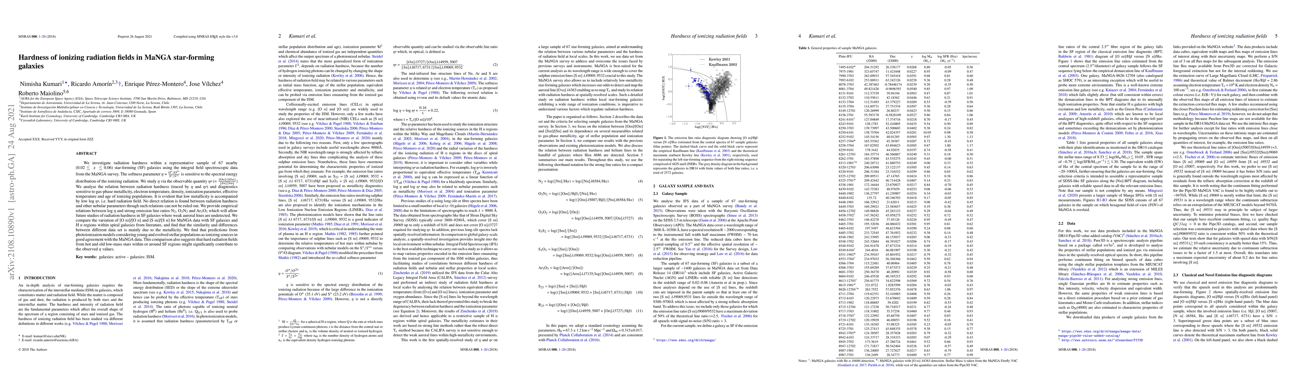 This paper examines the hardness of ionizing radiation fields in nearby star-forming galaxies using MaNGA survey data, finding a correlation between low metallicity and harder radiation fields. It provides empirical relations between radiation hardness and emission line ratios, suggesting that old, low-mass stars in star-forming regions contribute to the observed radiation hardness.