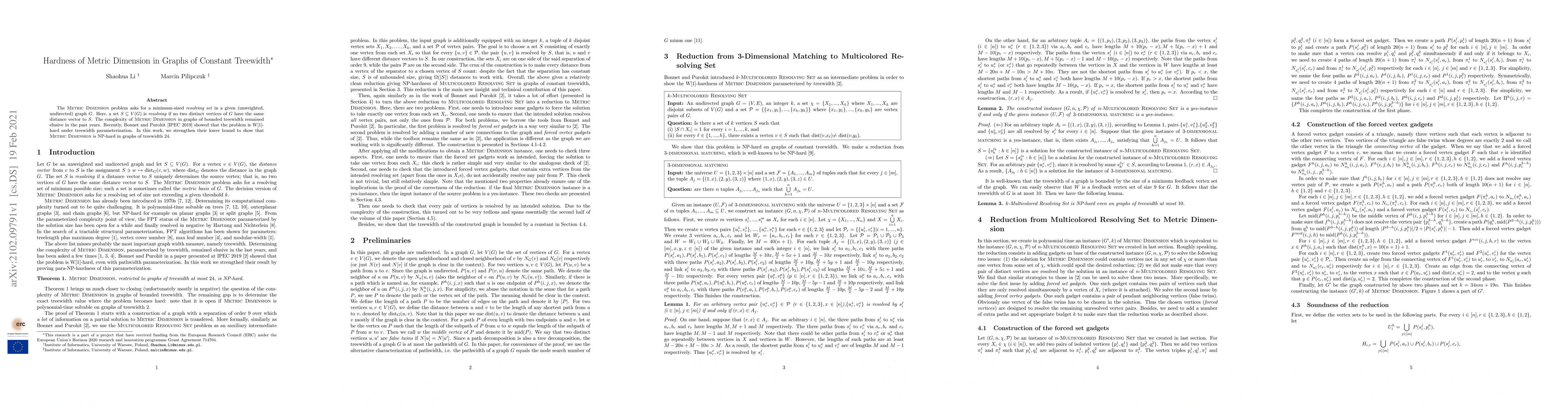 This paper demonstrates that the Metric Dimension problem is NP-hard for graphs with treewidth 24, strengthening previous results showing its W[1]-hardness under treewidth parameterization. This resolves the complexity status for this class of graphs.
