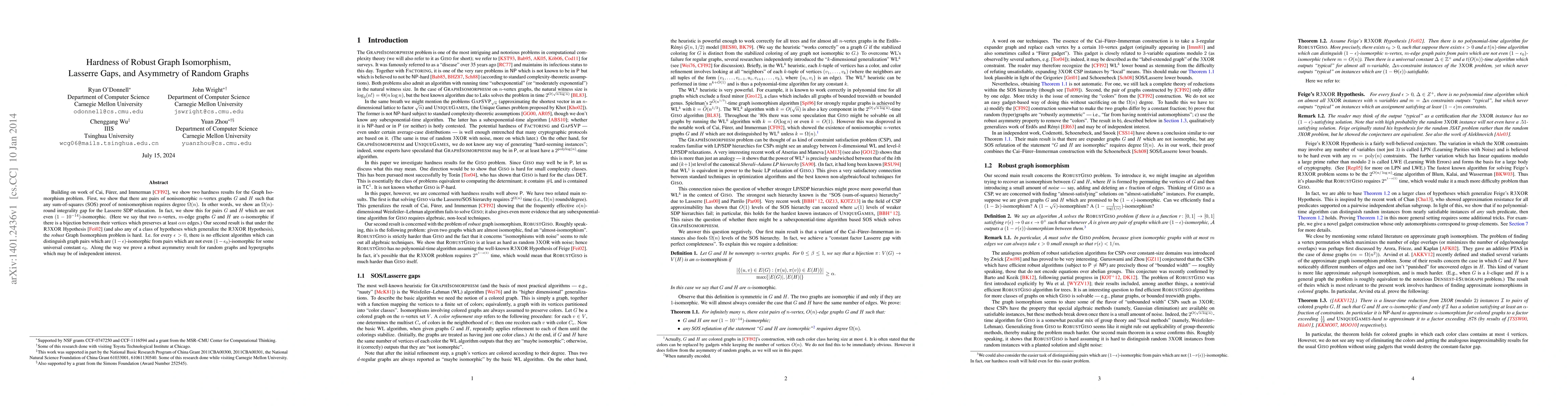 Building on work of Cai, F\"urer, and Immerman \cite{CFI92}, we show two hardness results for the Graph Isomorphism problem. First, we show that there are pairs of nonisomorphic $n$-vertex graphs $G$ and $H$ such that any sum-of-squares (SOS) proof of nonisomorphism requires degree $\Omega(n)$. In other words, we show an $\Omega(n)$-round integrality gap for the Lasserre SDP relaxation. In fact, we show this for pairs $G$ and $H$ which are not even $(1-10^{-14})$-isomorphic. (Here we say that two $n$-vertex, $m$-edge graphs $G$ and $H$ are $\alpha$-isomorphic if there is a bijection between their vertices which preserves at least $\alpha m$ edges.) Our second result is that under the {\sc R3XOR} Hypothesis \cite{Fei02} (and also any of a class of hypotheses which generalize the {\sc R3XOR} Hypothesis), the \emph{robust} Graph Isomorphism problem is hard. I.e.\ for every $\epsilon > 0$, there is no efficient algorithm which can distinguish graph pairs which are $(1-\epsilon)$-isomorphic from pairs which are not even $(1-\epsilon_0)$-isomorphic for some universal constant $\epsilon_0$. Along the way we prove a robust asymmetry result for random graphs and hypergraphs which may be of independent interest.