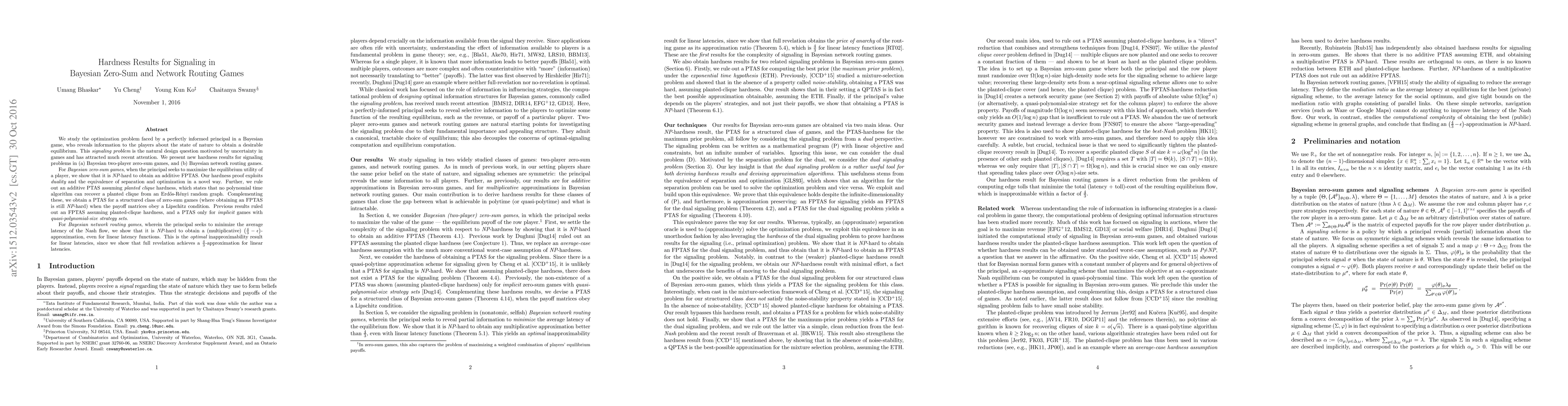 This paper presents new hardness results for signaling problems in Bayesian zero-sum games and Bayesian network routing games. It shows NP-hardness for obtaining additive FPTAS in zero-sum games and a $(4/3 - \epsilon)$-approximation for network routing games, ruling out PTAS under planted clique hardness.