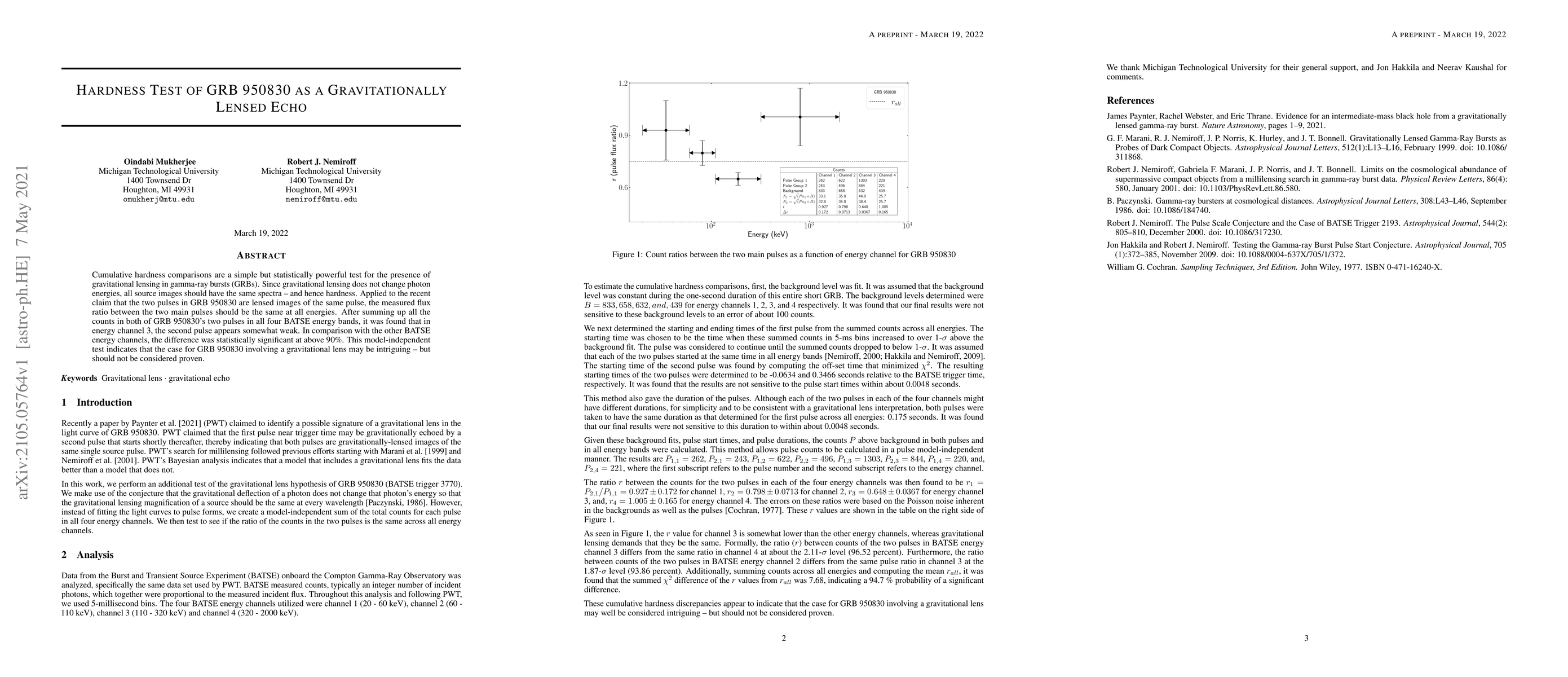 A study found that a gamma-ray burst (GRB) 950830 may exhibit gravitational lensing effects, indicated by significant differences in flux ratios between two pulses across different energy bands, suggesting the possibility of lensing.