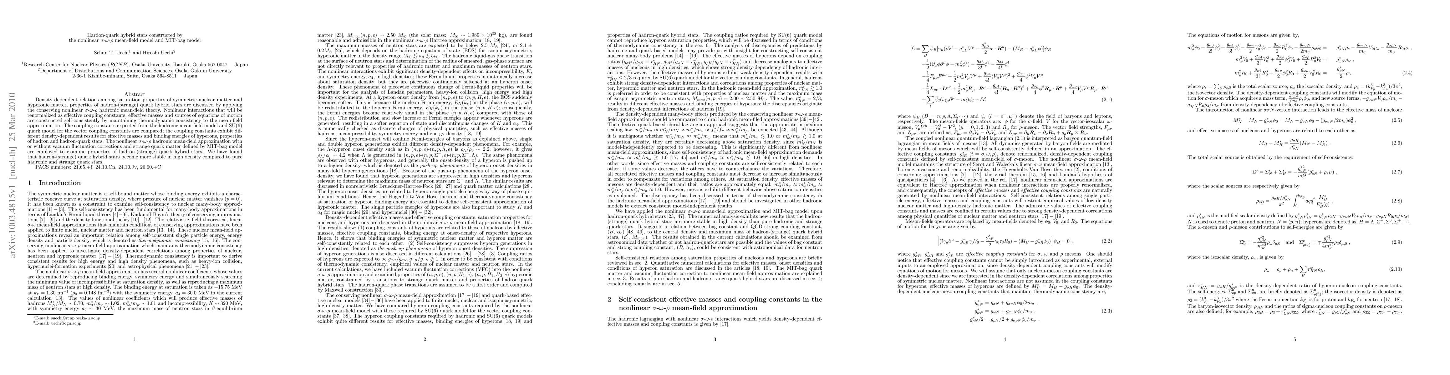 Density-dependent relations among saturation properties of symmetric nuclear matter and hyperonic matter, properties of hadron-(strange) quark hybrid stars are discussed by applying the conserving nonlinear $\sigma$-$\omega$-$\rho$ hadronic mean-field theory. Nonlinear interactions that will be renormalized as effective coupling constants, effective masses and sources of equations of motion are constructed self-consistently by maintaining thermodynamic consistency to the mean-field approximation. The coupling constants expected from the hadronic mean-field model and SU(6) quark model for the vector coupling constants are compared; the coupling constants exhibit different density-dependent results for effective masses and binding energies of hyperons, properties of hadron and hadron-quark stars. The nonlinear $\sigma$-$\omega$-$\rho$ hadronic mean-field approximation with or without vacuum fluctuation corrections and strange quark matter defined by MIT-bag model are employed to examine properties of hadron-(strange) quark hybrid stars. We have found that hadron-(strange) quark hybrid stars become more stable in high density compared to pure hadronic and strange quark stars.