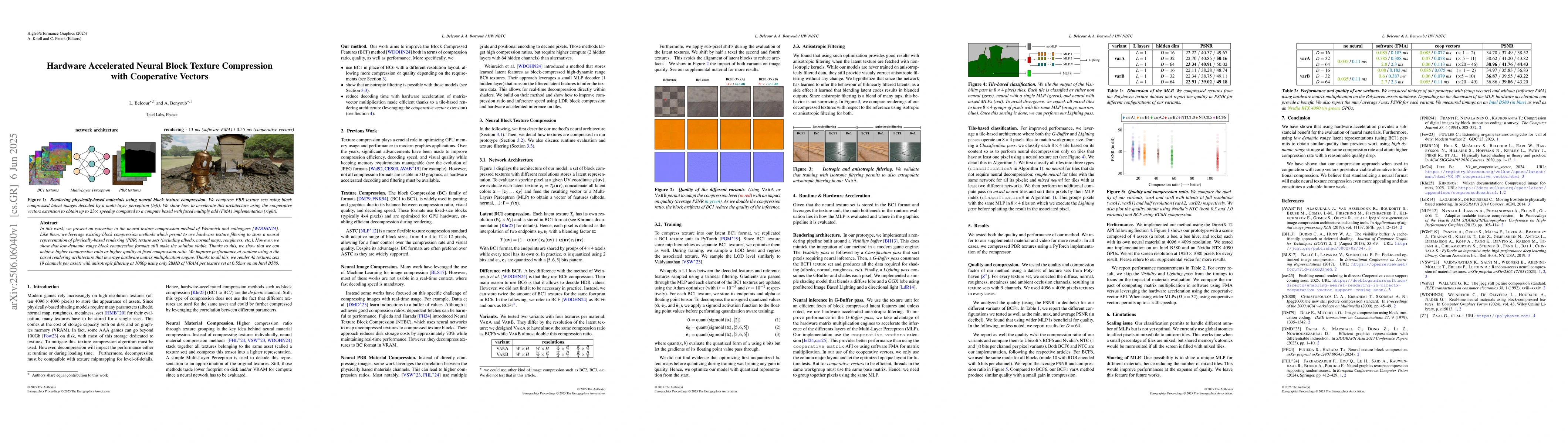 This research extends a neural texture compression method, utilizing hardware texture filtering for storing PBR texture sets. It demonstrates higher compression ratios or better quality at fixed ratios, and efficient runtime performance using tile-based rendering and hardware matrix multiplication. The method successfully renders 4k texture sets (9 channels) with anisotropic filtering at 1080p using just 28MB of VRAM per set in 0.55ms on an Intel B580.