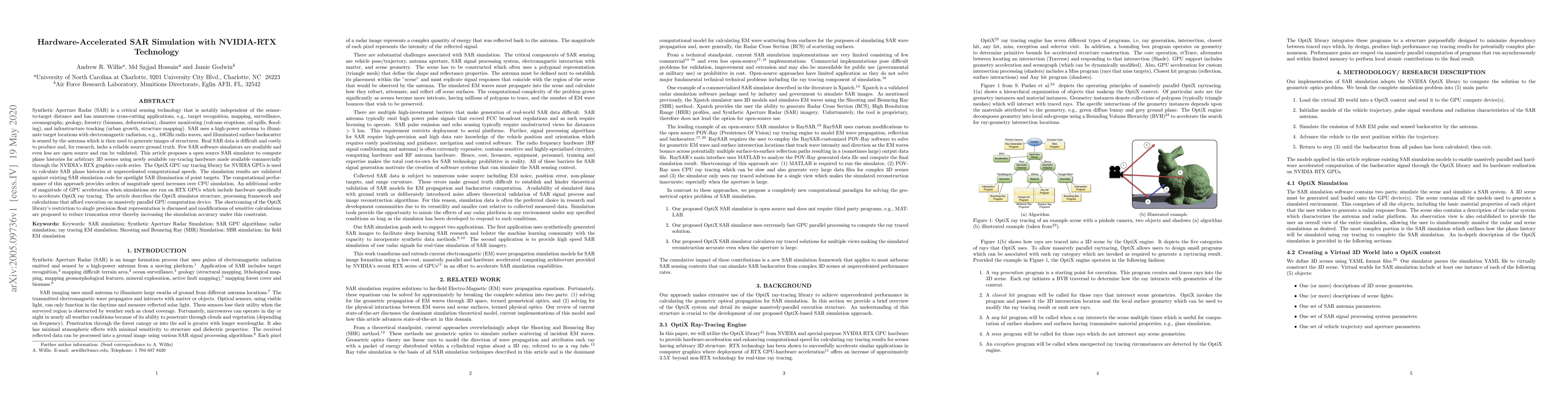 This paper presents an open-source SAR simulator utilizing NVIDIA RTX GPUs and the OptiX ray tracing library to achieve significant speed improvements over CPU-based simulations. The RTX hardware provides an order of magnitude acceleration, with further gains on RTX GPUs, though single precision limitations are addressed to maintain simulation accuracy.
