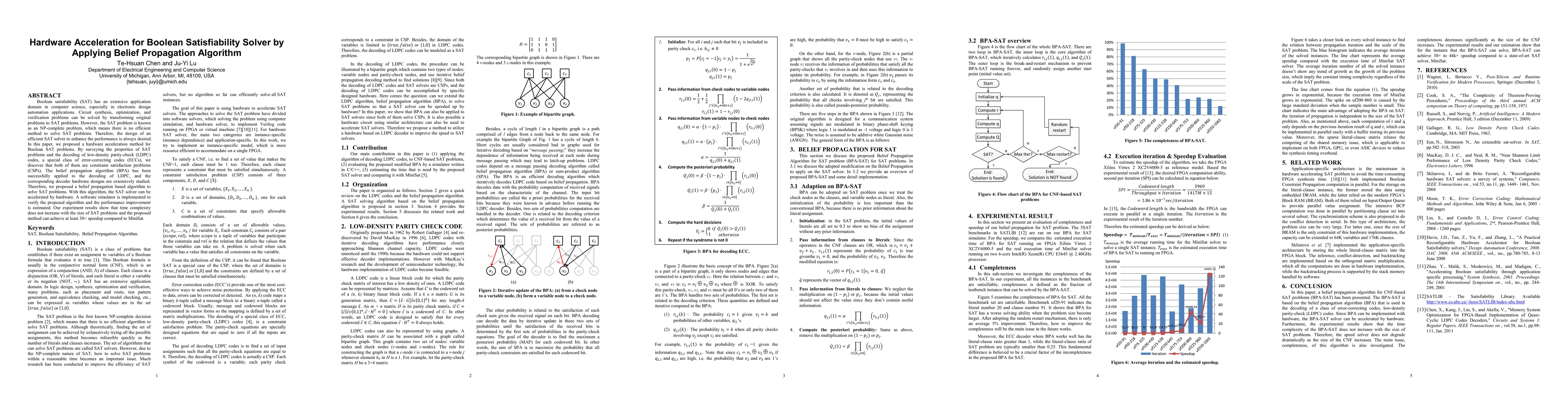 Boolean satisfiability (SAT) has an extensive application domain in computer science, especially in electronic design automation applications. Circuit synthesis, optimization, and verification problems can be solved by transforming original problems to SAT problems. However, the SAT problem is known as NP-complete, which means there is no efficient method to solve it. Therefore, an efficient SAT solver to enhance the performance is always desired. We propose a hardware acceleration method for SAT problems. By surveying the properties of SAT problems and the decoding of low-density parity-check (LDPC) codes, a special class of error-correcting codes, we discover that both of them are constraint satisfaction problems. The belief propagation algorithm has been successfully applied to the decoding of LDPC, and the corresponding decoder hardware designs are extensively studied. Therefore, we proposed a belief propagation based algorithm to solve SAT problems. With this algorithm, the SAT solver can be accelerated by hardware. A software simulator is implemented to verify the proposed algorithm and the performance improvement is estimated. Our experiment results show that time complexity does not increase with the size of SAT problems and the proposed method can achieve at least 30x speedup compared to MiniSat.