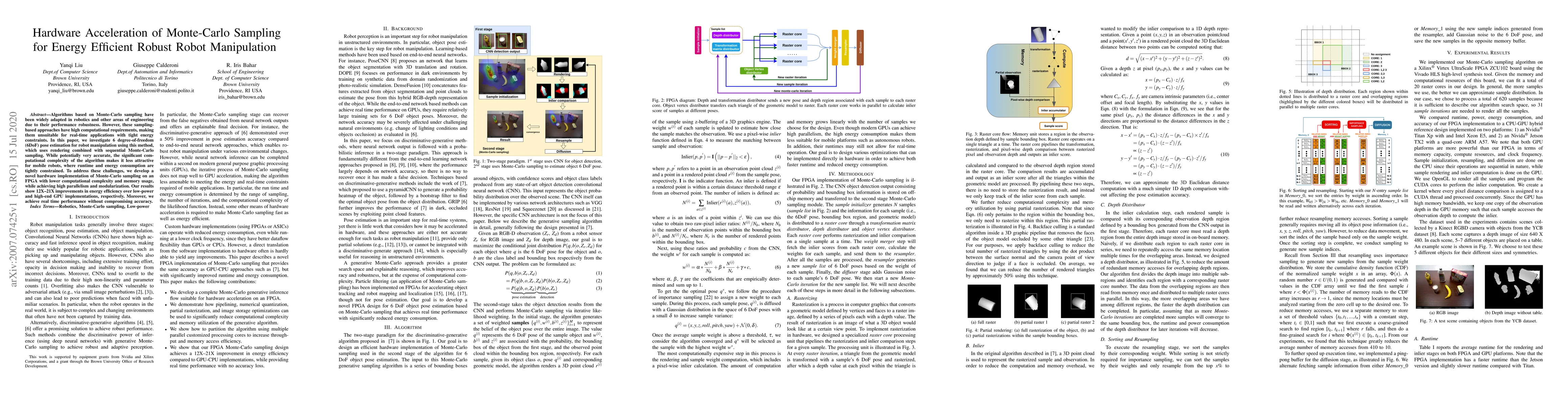 Algorithms based on Monte-Carlo sampling have been widely adapted in robotics and other areas of engineering due to their performance robustness. However, these sampling-based approaches have high computational requirements, making them unsuitable for real-time applications with tight energy constraints. In this paper, we investigate 6 degree-of-freedom (6DoF) pose estimation for robot manipulation using this method, which uses rendering combined with sequential Monte-Carlo sampling. While potentially very accurate, the significant computational complexity of the algorithm makes it less attractive for mobile robots, where runtime and energy consumption are tightly constrained. To address these challenges, we develop a novel hardware implementation of Monte-Carlo sampling on an FPGA with lower computational complexity and memory usage, while achieving high parallelism and modularization. Our results show 12X-21X improvements in energy efficiency over low-power and high-end GPU implementations, respectively. Moreover, we achieve real time performance without compromising accuracy.