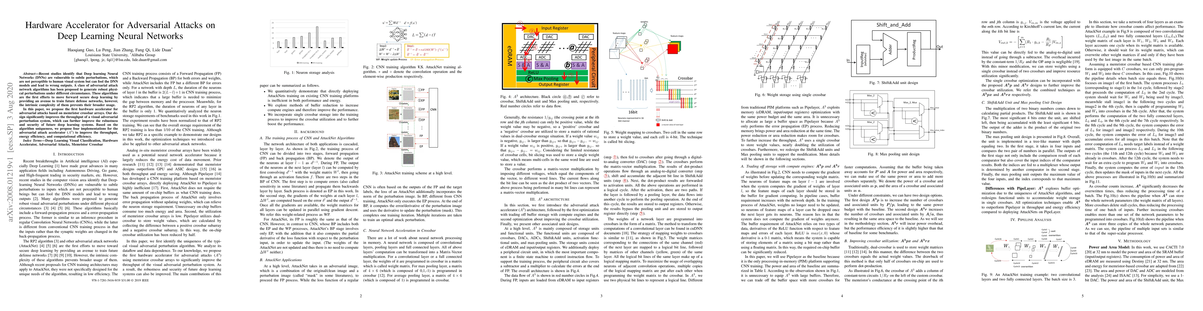 Recent studies identify that Deep learning Neural Networks (DNNs) are vulnerable to subtle perturbations, which are not perceptible to human visual system but can fool the DNN models and lead to wrong outputs. A class of adversarial attack network algorithms has been proposed to generate robust physical perturbations under different circumstances. These algorithms are the first efforts to move forward secure deep learning by providing an avenue to train future defense networks, however, the intrinsic complexity of them prevents their broader usage. In this paper, we propose the first hardware accelerator for adversarial attacks based on memristor crossbar arrays. Our design significantly improves the throughput of a visual adversarial perturbation system, which can further improve the robustness and security of future deep learning systems. Based on the algorithm uniqueness, we propose four implementations for the adversarial attack accelerator ($A^3$) to improve the throughput, energy efficiency, and computational efficiency.