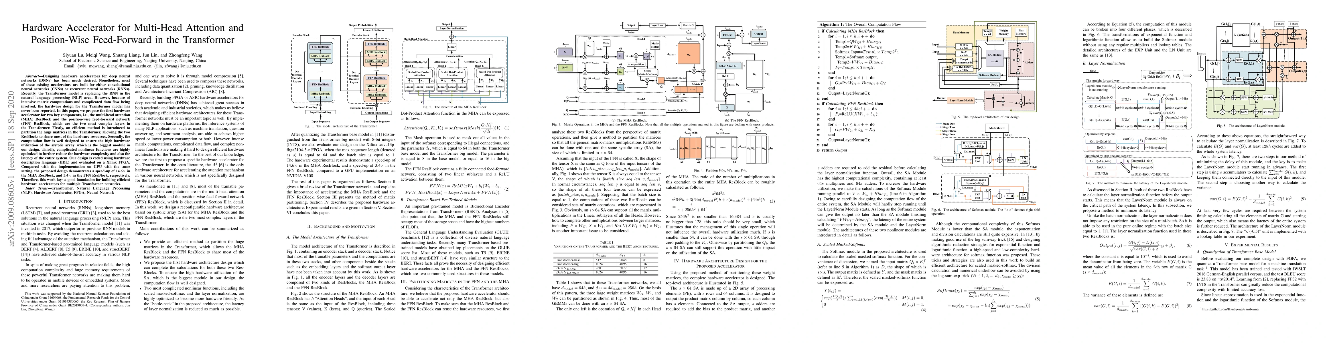 This paper proposes the first hardware accelerator for the multi-head attention and position-wise feed-forward network in the Transformer model, optimizing matrix partitioning and computation flow to enhance hardware utilization. The design achieves significant speed-ups on an FPGA compared to GPU implementations, laying a foundation for efficient Transformer hardware accelerators.