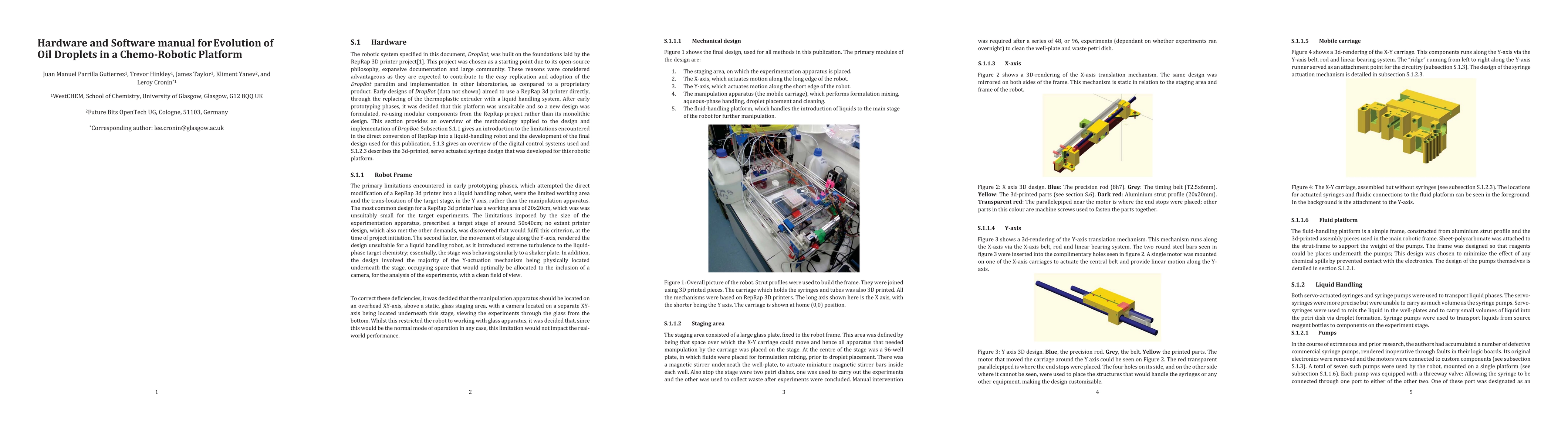 This manual outlines a fully automated liquid handling robot to enable physically-embodied evolution within a chemical oil-droplet system. The robot is based upon the REPRAP3D printer system and makes the droplets by mixing chemicals and then placing them in a petri dish after which they are recorded using a camera and the behaviour of the droplets analysed using image recognition software. This manual accompanies the open access publication published in Nature Communications DOI: 10.1038/ncomms6571.