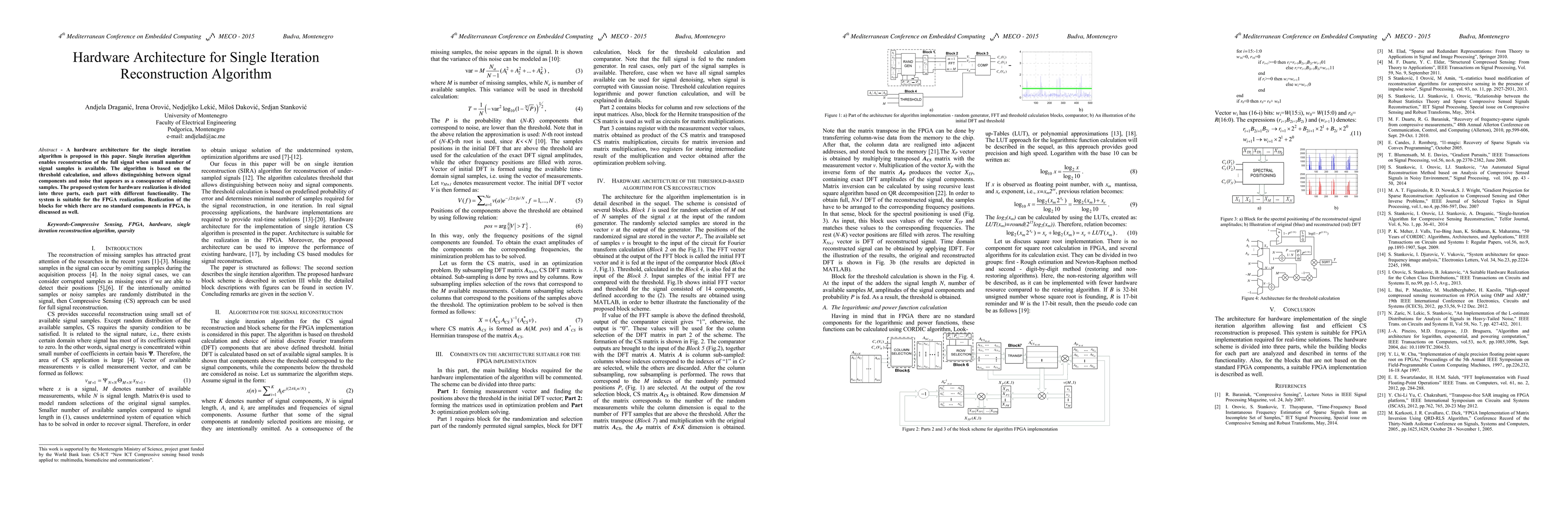 This paper proposes a hardware architecture for a single iteration reconstruction algorithm, enabling full signal reconstruction from a small number of samples. The system is divided into three functional parts, suitable for FPGA implementation, with discussions on realizing blocks lacking standard FPGA components.