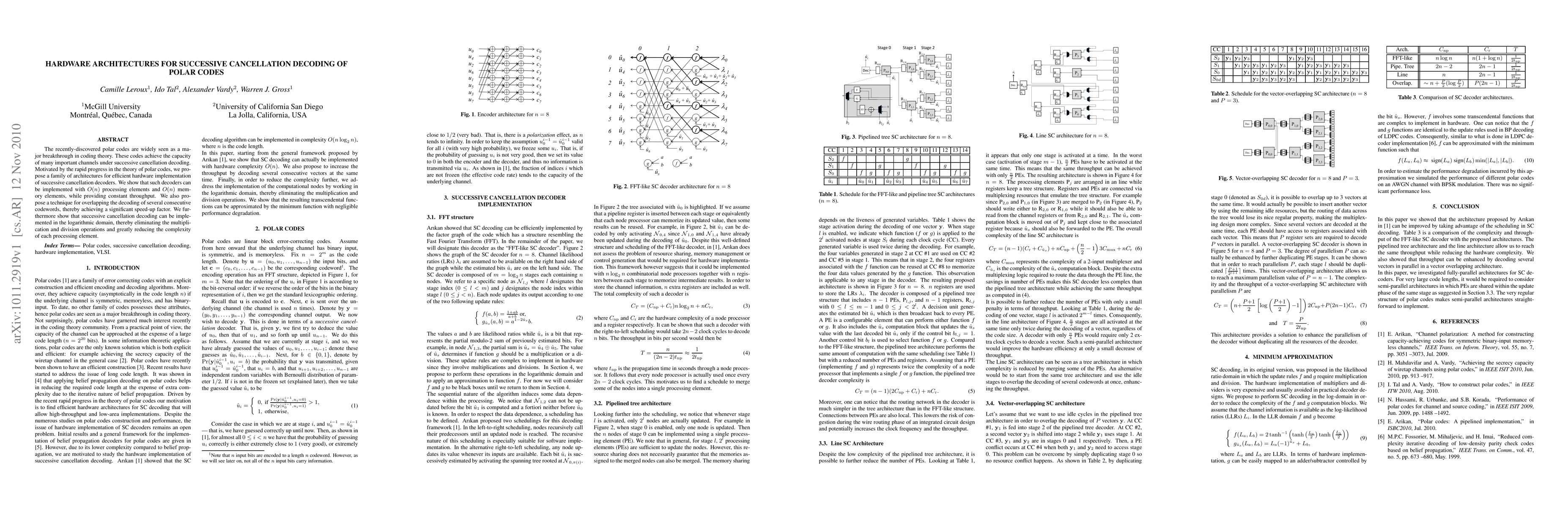 This paper proposes efficient hardware architectures for implementing successive cancellation decoders for polar codes, achieving O(n) processing and memory elements with constant throughput. It introduces a technique to overlap decoding of multiple codewords for speed-up and demonstrates a logarithmic domain implementation to reduce complexity.