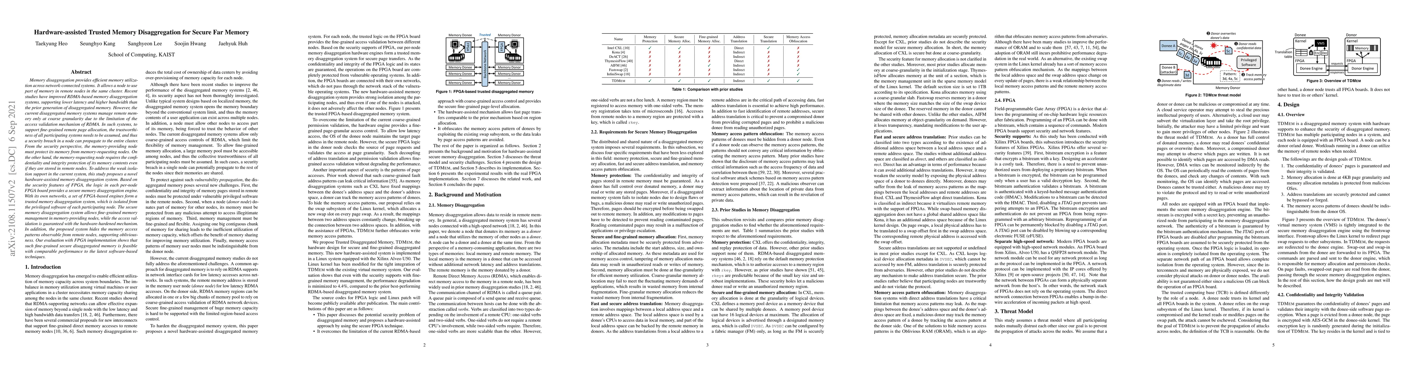This paper proposes a hardware-assisted memory disaggregation system using FPGA-based secure engines to enable fine-grained memory management and isolation, addressing security vulnerabilities in current RDMA-based systems. The system ensures confidentiality, integrity, and obliviousness of memory contents, demonstrating comparable performance to software-based techniques.