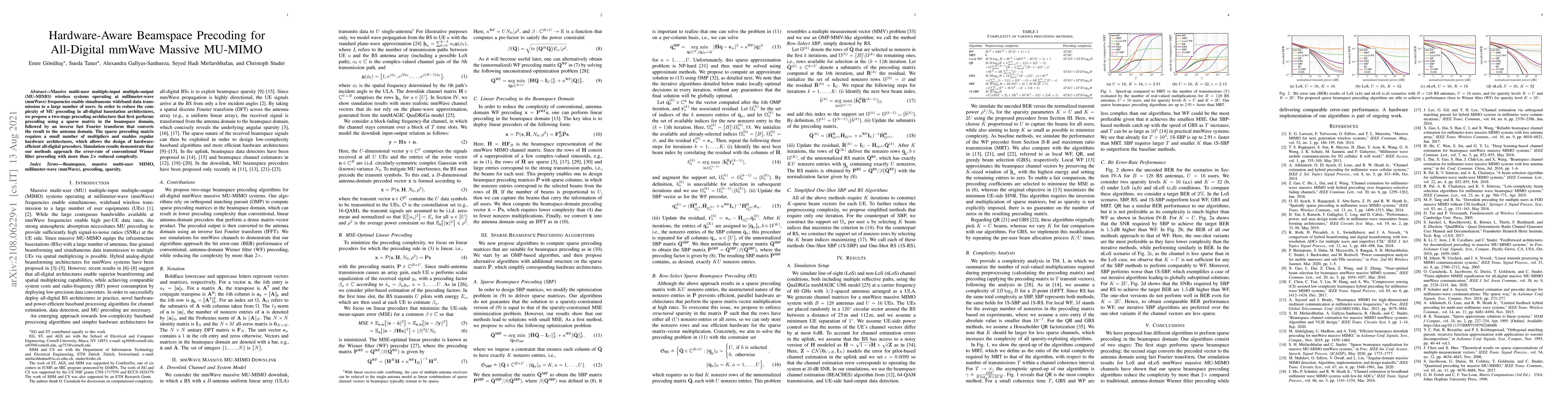 This paper proposes a hardware-aware beamspace precoding method for all-digital mmWave massive MU-MIMO systems to reduce precoding complexity. The two-stage approach uses a sparse matrix in the beamspace domain followed by an inverse fast Fourier transform, achieving near-optimal error-rate with significantly lower complexity.