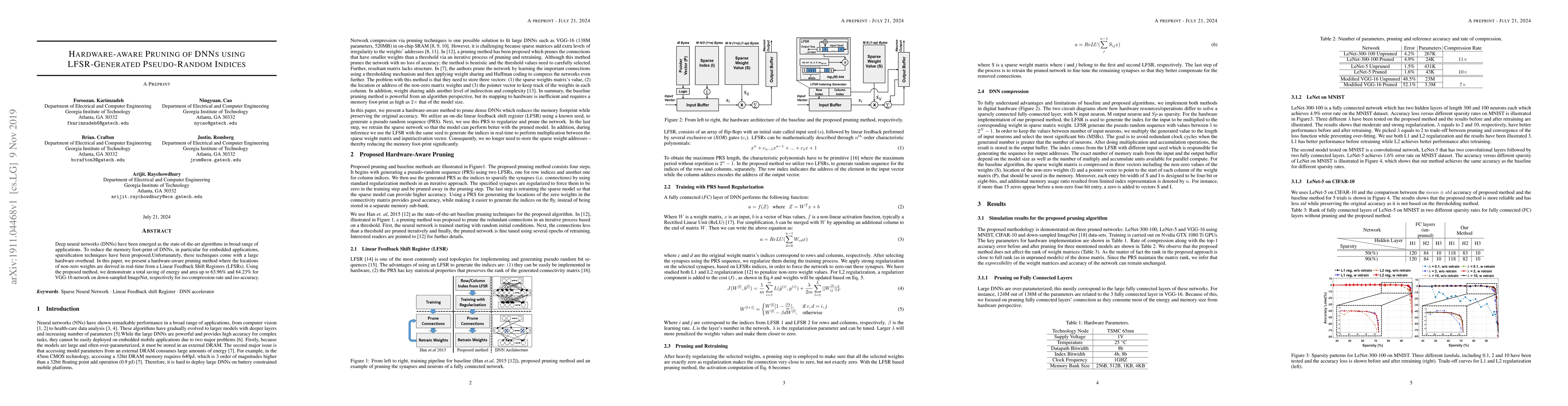 Deep neural networks (DNNs) have been emerged as the state-of-the-art algorithms in broad range of applications. To reduce the memory foot-print of DNNs, in particular for embedded applications, sparsification techniques have been proposed. Unfortunately, these techniques come with a large hardware overhead. In this paper, we present a hardware-aware pruning method where the locations of non-zero weights are derived in real-time from a Linear Feedback Shift Registers (LFSRs). Using the proposed method, we demonstrate a total saving of energy and area up to 63.96% and 64.23% for VGG-16 network on down-sampled ImageNet, respectively for iso-compression-rate and iso-accuracy.