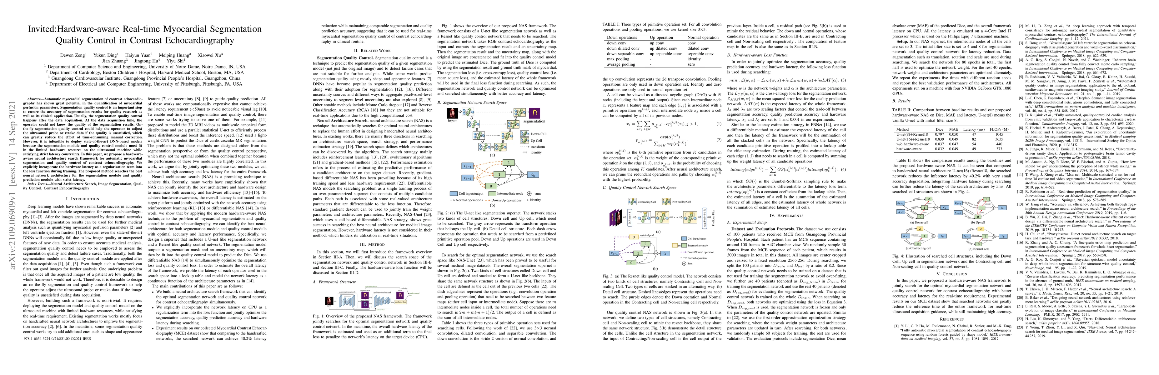 This paper proposes a hardware-aware neural architecture search framework for real-time myocardial segmentation and quality control in contrast echocardiography, incorporating hardware latency into the training loss to optimize performance within strict latency constraints. The method aims to enable on-the-fly quality control to reduce manual corrections.
