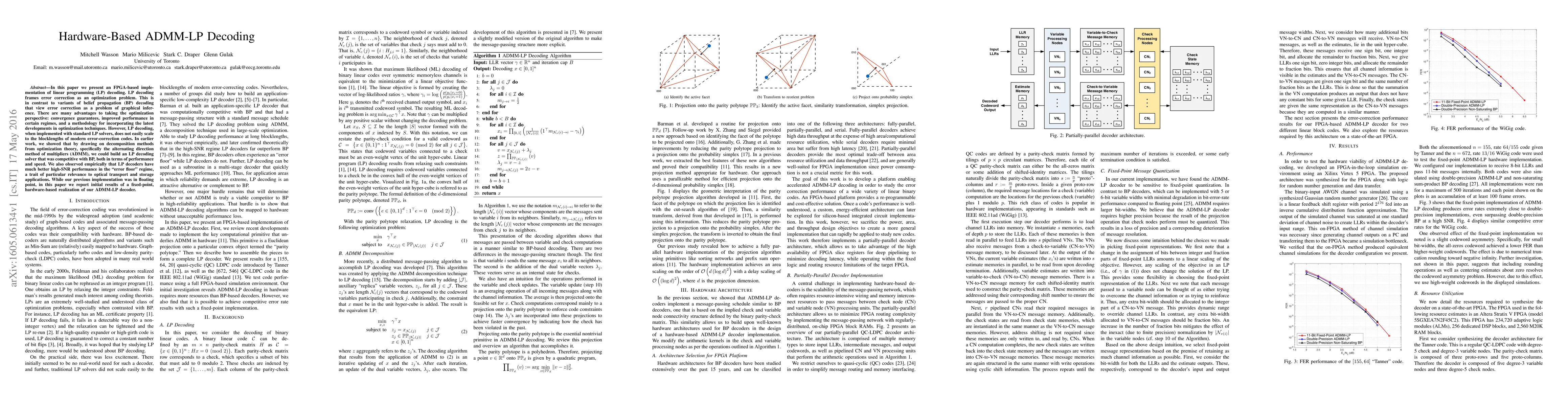 This paper presents an FPGA-based implementation of linear programming (LP) decoding for error correction, utilizing the alternating direction method of multipliers (ADMM) to achieve competitive performance with belief propagation. The fixed-point hardware version shows improved high-SNR performance, especially relevant for optical transport and storage.