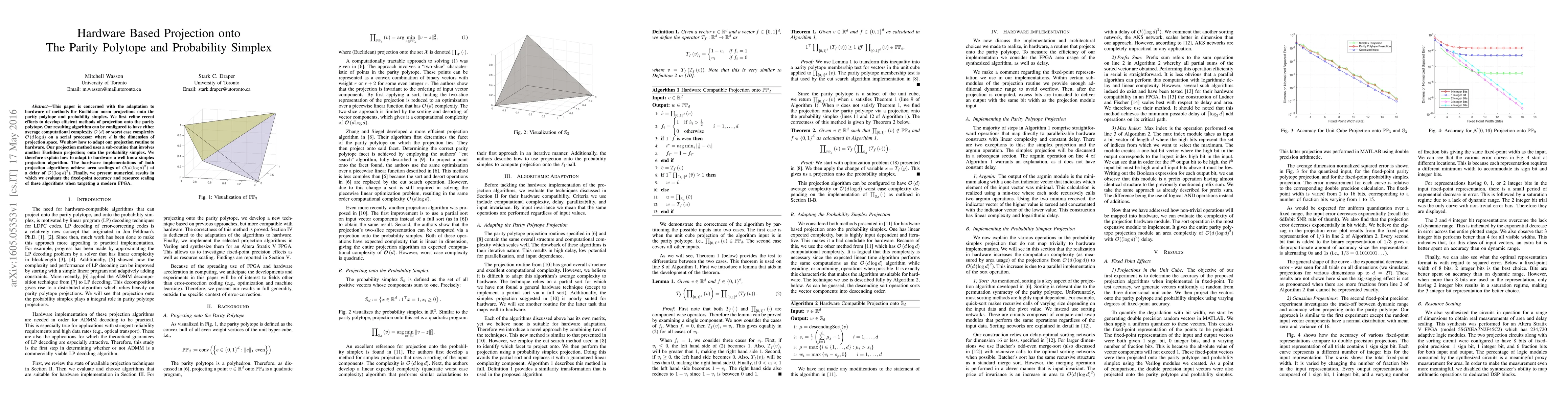 Researchers developed efficient hardware-based projection algorithms for Euclidean norm projections onto the parity polytope and probability simplex, achieving area scalings of O(d*(log(d))^2) at a delay of O((log(d))^2).