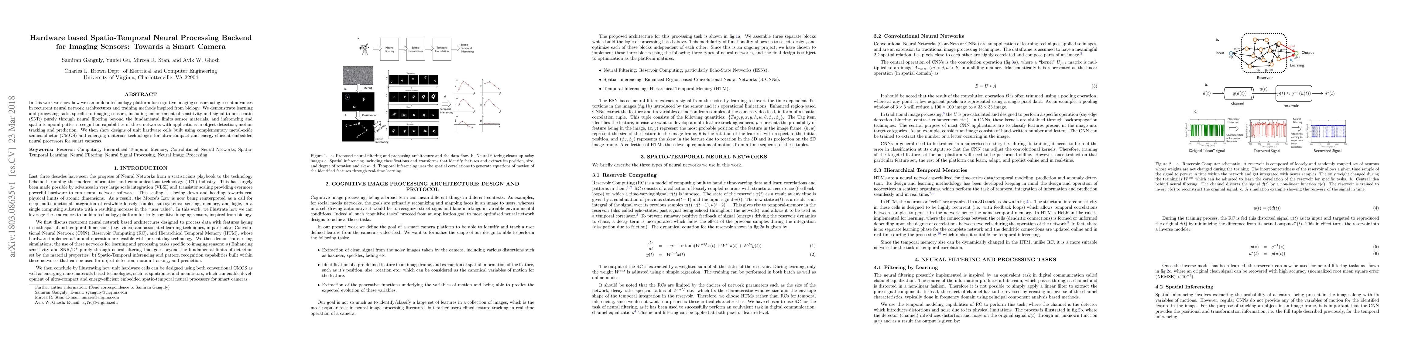 In this work we show how we can build a technology platform for cognitive imaging sensors using recent advances in recurrent neural network architectures and training methods inspired from biology. We demonstrate learning and processing tasks specific to imaging sensors, including enhancement of sensitivity and signal-to-noise ratio (SNR) purely through neural filtering beyond the fundamental limits sensor materials, and inferencing and spatio-temporal pattern recognition capabilities of these networks with applications in object detection, motion tracking and prediction. We then show designs of unit hardware cells built using complementary metal-oxide semiconductor (CMOS) and emerging materials technologies for ultra-compact and energy-efficient embedded neural processors for smart cameras.