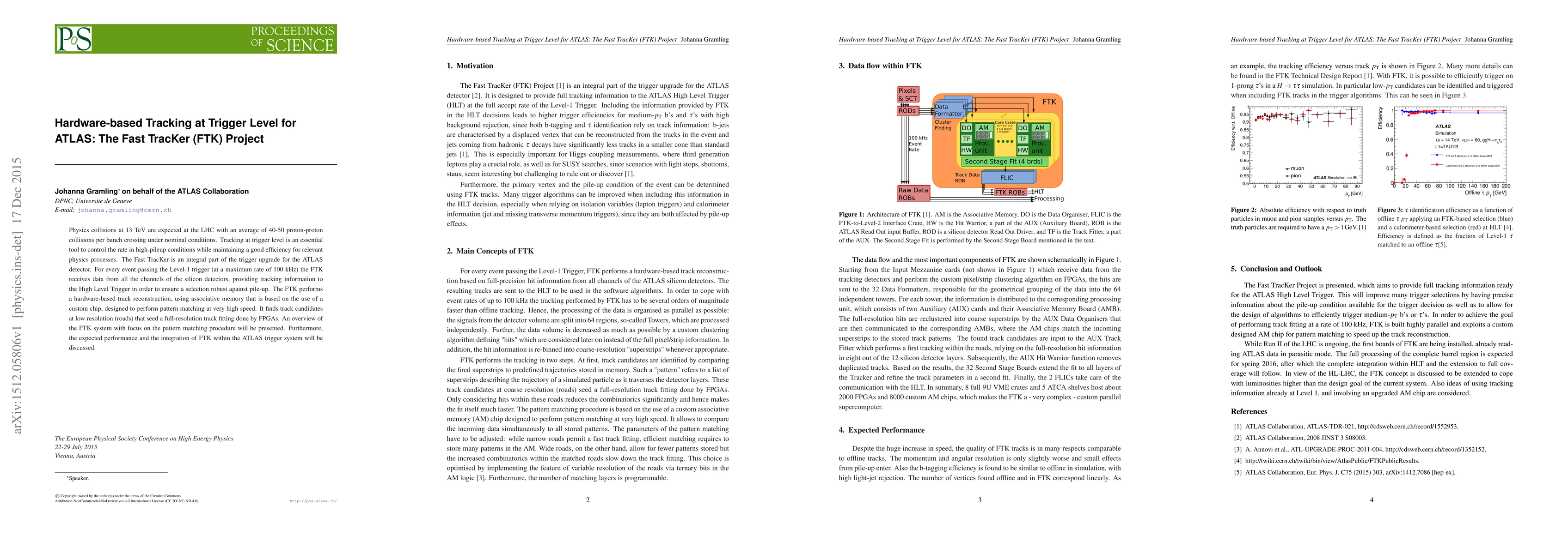 The Fast TracKer (FTK) project for ATLAS detector at LHC implements hardware-based tracking at trigger level to manage high-pileup collision rates. It uses custom chips for fast pattern matching and FPGA-based full-resolution track fitting, ensuring robust selection of relevant physics processes.