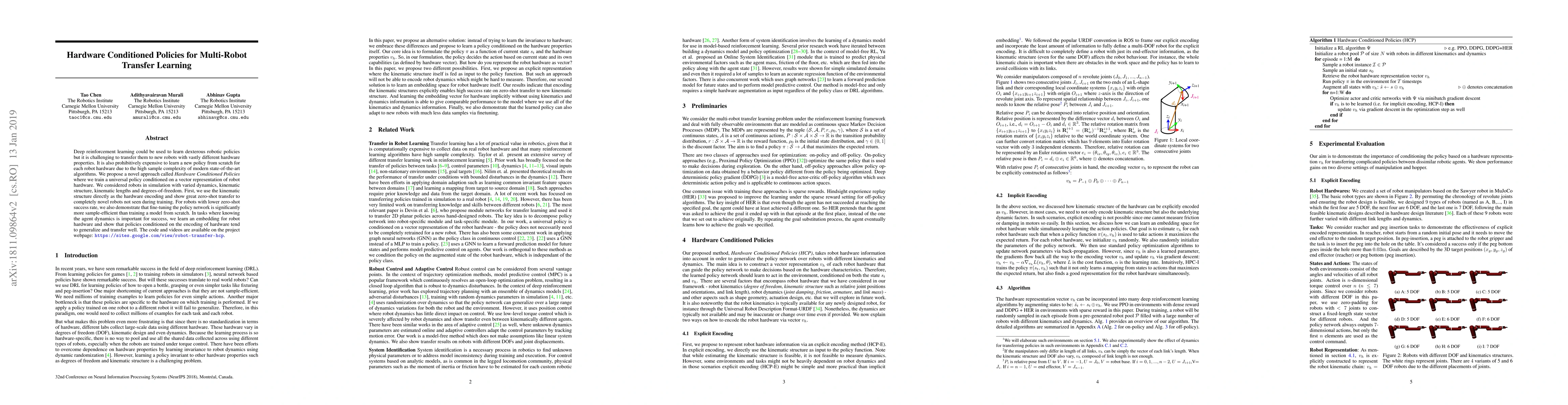 This paper proposes "Hardware Conditioned Policies" to enable efficient transfer learning of reinforcement learning policies across robots with different hardware properties. The approach trains a universal policy conditioned on a hardware representation vector, enabling zero-shot transfer and significantly more sample-efficient fine-tuning compared to training from scratch.