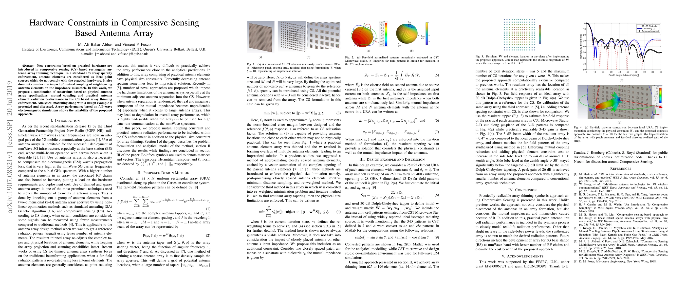 This paper introduces practical hardware constraints for compressive sensing-based antenna array thinning, addressing the discrepancies between ideal and real antenna elements, including mutual coupling effects. The new approach combines physical specifications, mutual coupling, and radiation performance, validated through analytical modeling and full-wave electromagnetic simulations.