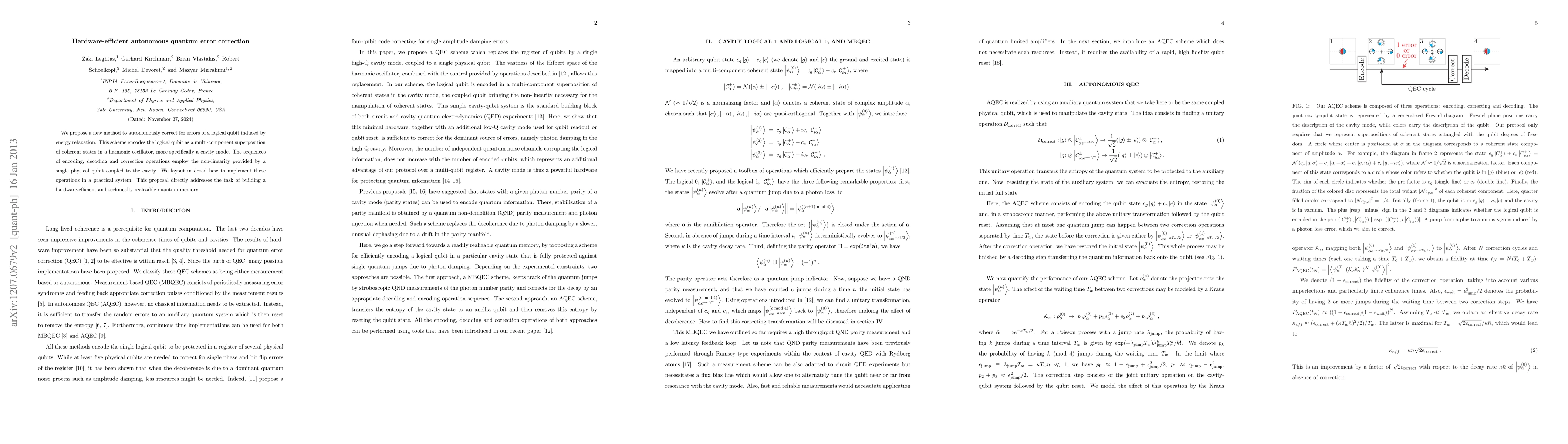 This paper proposes a novel hardware-efficient method for autonomous quantum error correction using a logical qubit encoded in a multi-component superposition of coherent states in a cavity mode, with error correction facilitated by a single physical qubit coupled to the cavity. The method aims to build a technically feasible quantum memory.