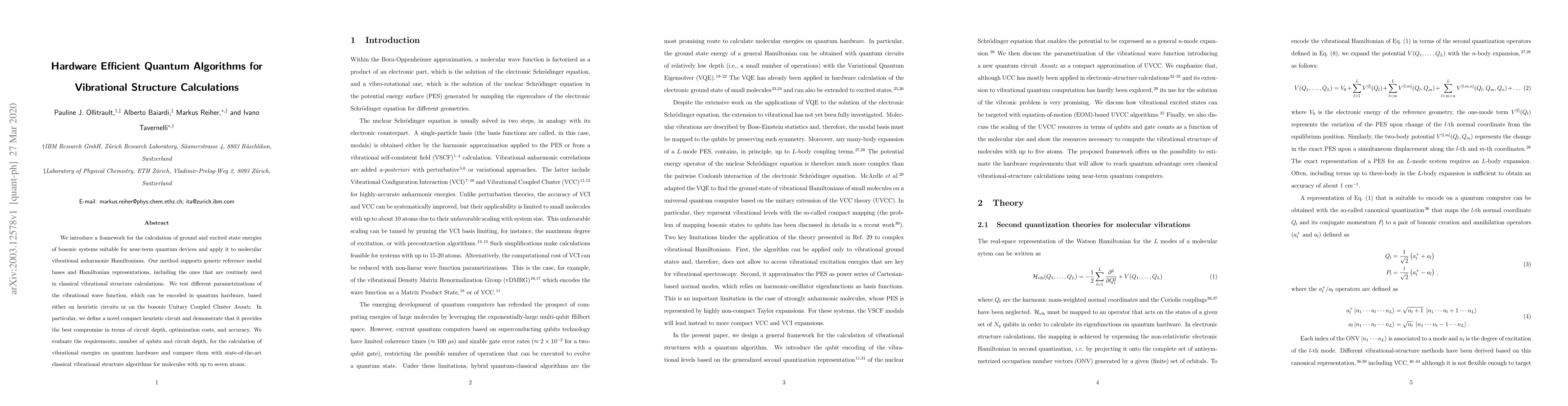 This paper presents a framework for calculating vibrational structures of bosonic systems using quantum algorithms tailored for near-term quantum devices. It introduces a novel compact heuristic circuit that offers a good balance between circuit depth, optimization costs, and accuracy, compared to classical methods for small molecules.