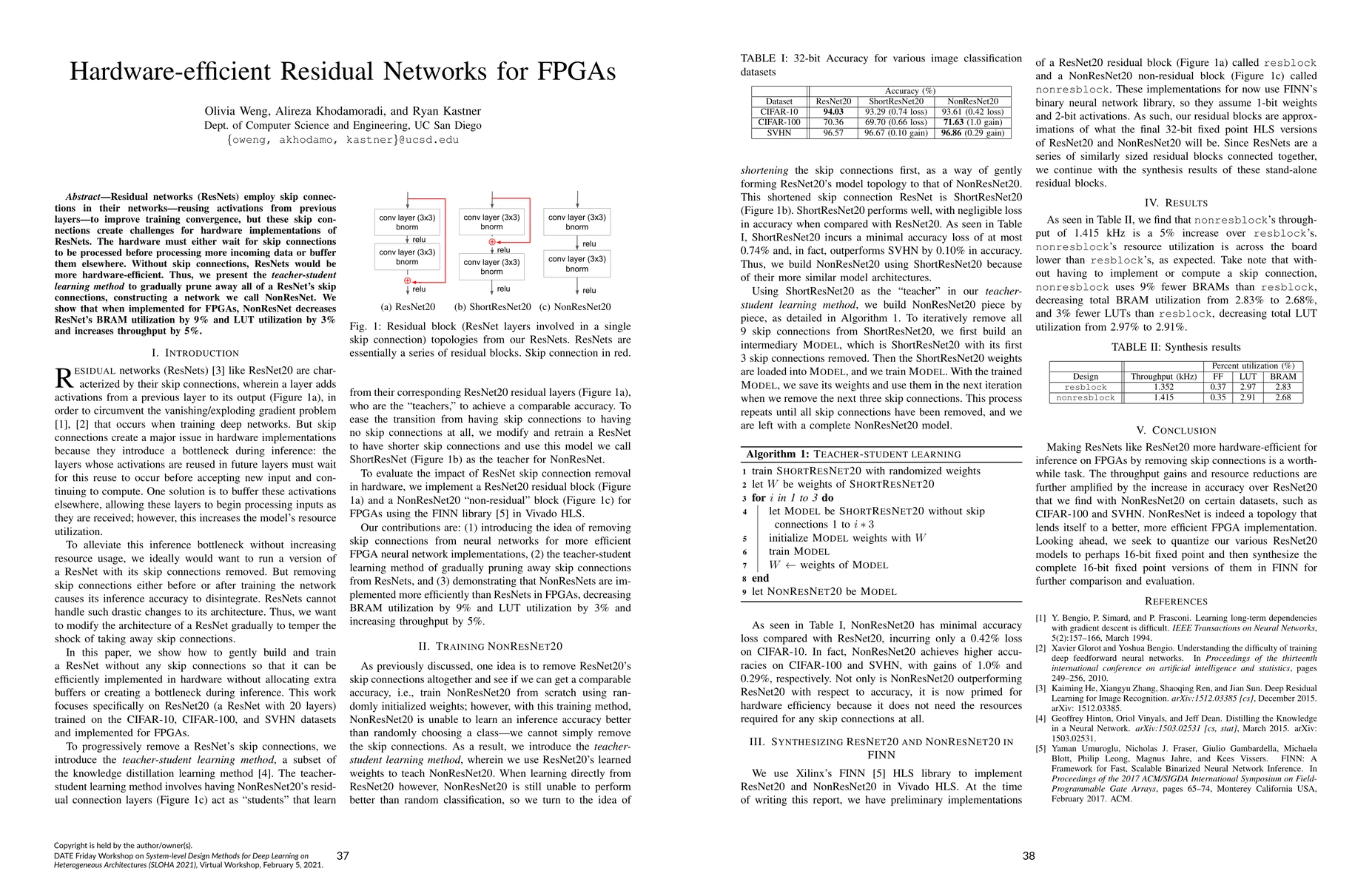 This paper proposes a teacher-student learning method to prune skip connections from residual networks, creating a hardware-efficient version called NonResNet. When implemented on FPGAs, NonResNet reduces BRAM and LUT utilization by 9% and 3% respectively, while increasing throughput by 5%.