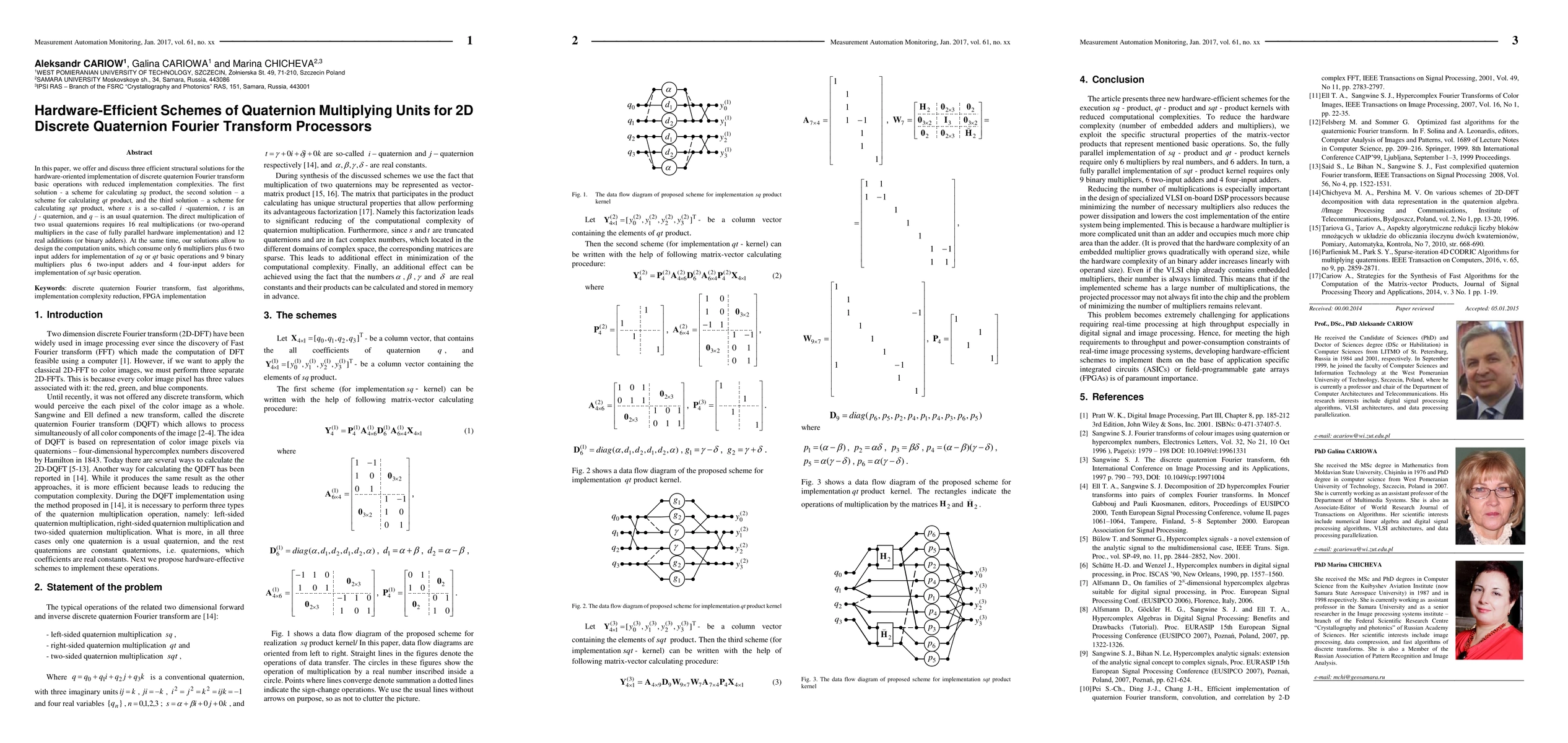 Researchers propose three efficient quaternion multiplication unit schemes for 2D discrete Fourier transform processors, reducing implementation complexities to 6-9 multipliers and 6 adders.