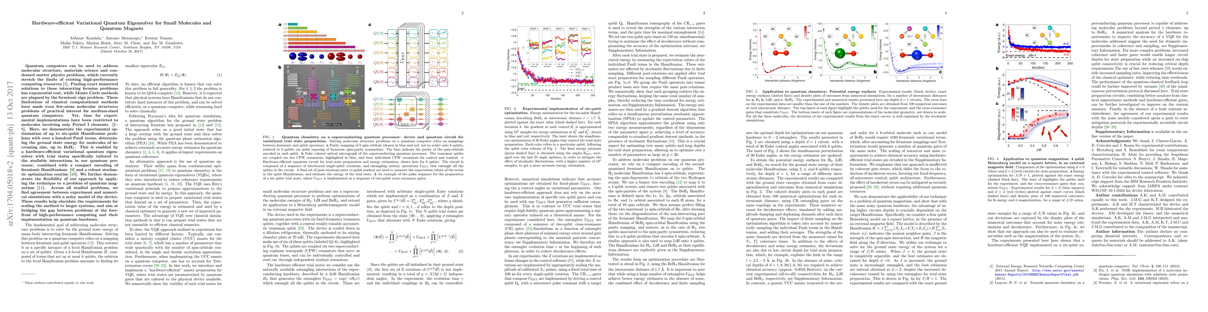This paper presents a hardware-efficient variational quantum eigensolver for solving Hamiltonian problems in small molecules and quantum magnets, demonstrating its application to molecules like BeH2 and quantum magnetism. The approach combines tailored trial states, compact encoding, and stochastic optimization, showing agreement between experimental results and simulations on a noisy model.