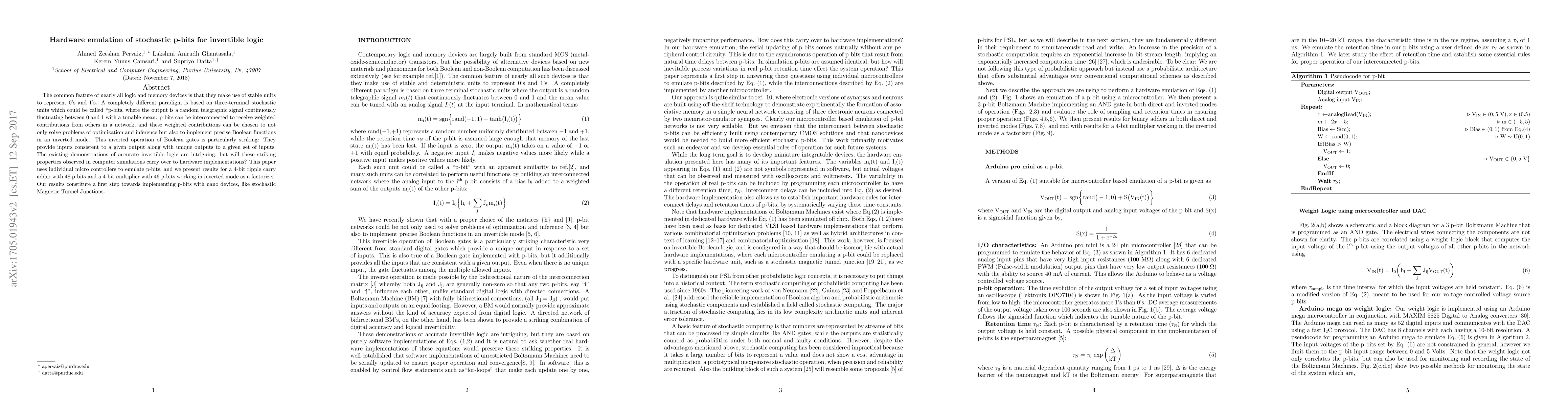 The common feature of nearly all logic and memory devices is that they make use of stable units to represent 0's and 1's. A completely different paradigm is based on three-terminal stochastic units which could be called "p-bits", where the output is a random telegraphic signal continuously fluctuating between 0 and 1 with a tunable mean. p-bits can be interconnected to receive weighted contributions from others in a network, and these weighted contributions can be chosen to not only solve problems of optimization and inference but also to implement precise Boolean functions in an inverted mode. This inverted operation of Boolean gates is particularly striking: They provide inputs consistent to a given output along with unique outputs to a given set of inputs. The existing demonstrations of accurate invertible logic are intriguing, but will these striking properties observed in computer simulations carry over to hardware implementations? This paper uses individual micro controllers to emulate p-bits, and we present results for a 4-bit ripple carry adder with 48 p-bits and a 4-bit multiplier with 46 p-bits working in inverted mode as a factorizer. Our results constitute a first step towards implementing p-bits with nano devices, like stochastic Magnetic Tunnel Junctions.