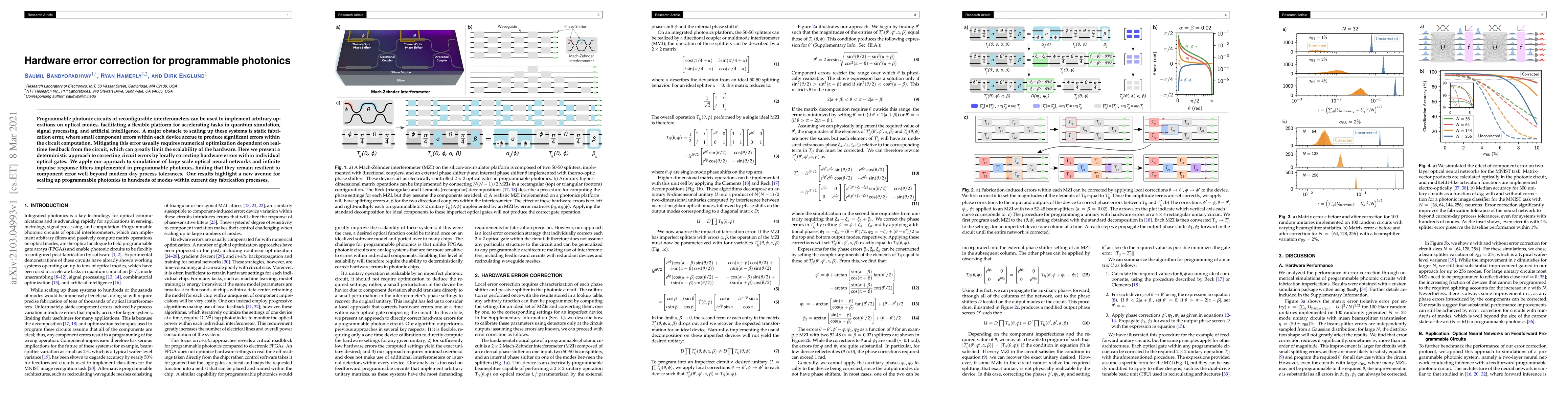 This paper proposes a deterministic method for correcting hardware errors in programmable photonic circuits, enabling scalability by maintaining performance despite fabrication imperfections. The approach demonstrates resilience in large-scale optical neural networks and filters, suggesting a viable path for scaling up photonic systems.