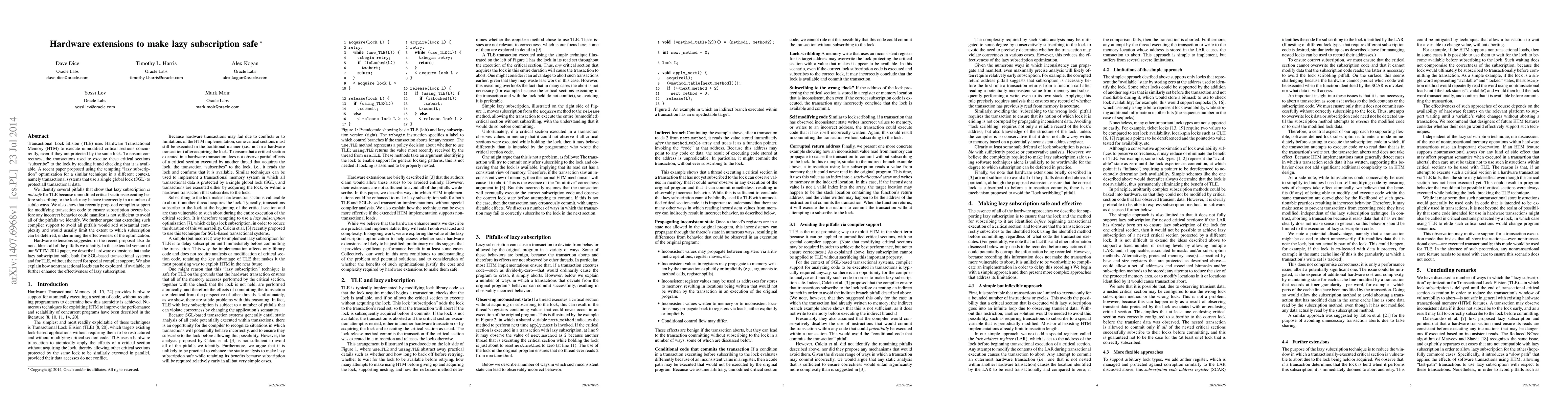 This paper identifies issues with the safety of "lazy subscription" in transactional systems using Hardware Transactional Memory (HTM), particularly in Transactional Lock Elision (TLE). It proposes hardware extensions to ensure the safety of lazy subscription without requiring special compiler support, and discusses how nontransactional loads can be used to enhance the optimization.