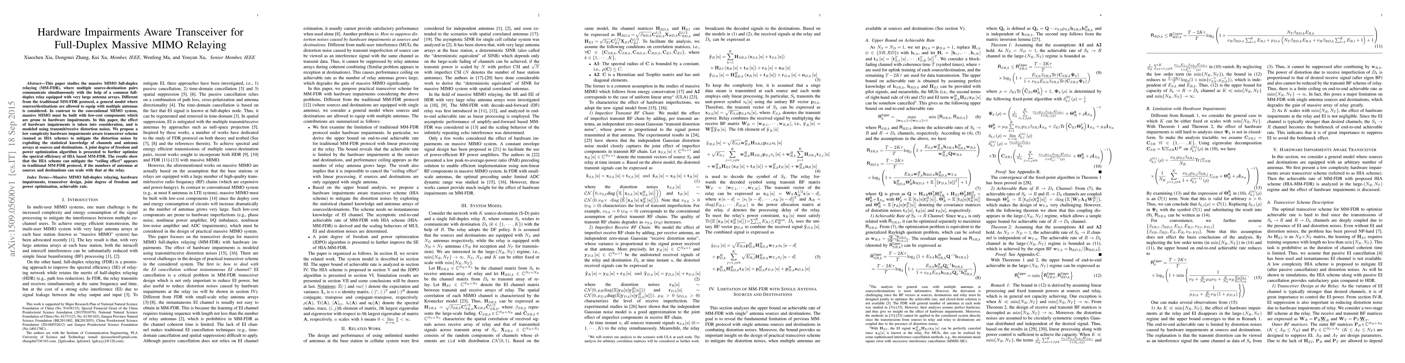 This paper proposes a hardware impairments aware transceiver scheme (HIA) for massive MIMO full-duplex relaying, addressing the "ceiling effect" by mitigating transmit/receive distortion noises. It optimizes spectral efficiency through a joint degree of freedom and power optimization algorithm.