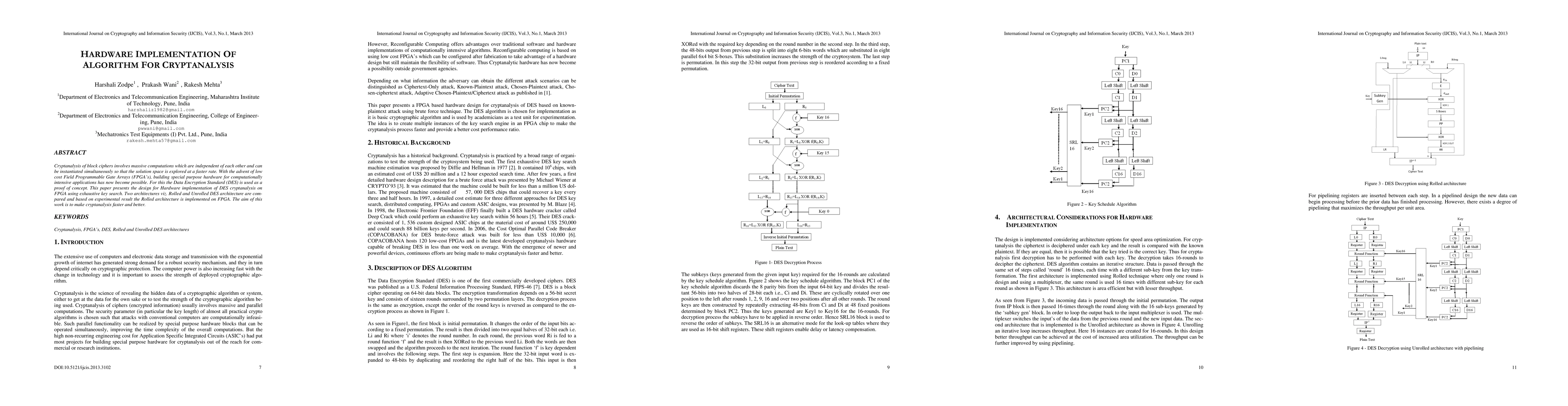This paper explores the hardware implementation of a cryptanalysis algorithm for the Data Encryption Standard (DES) using FPGAs. It compares Rolled and Unrolled DES architectures, ultimately favoring the Rolled architecture for faster and more efficient FPGA implementation to expedite exhaustive key search.