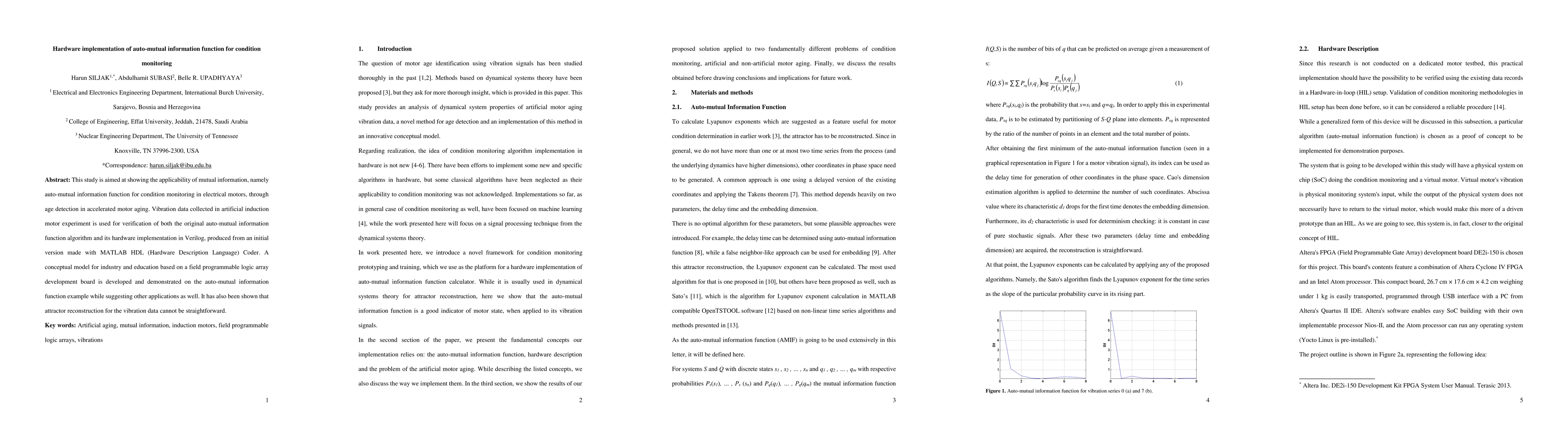 This study demonstrates a hardware implementation of an auto-mutual information function for condition monitoring in electrical motors, using vibration data from an artificial induction motor experiment.