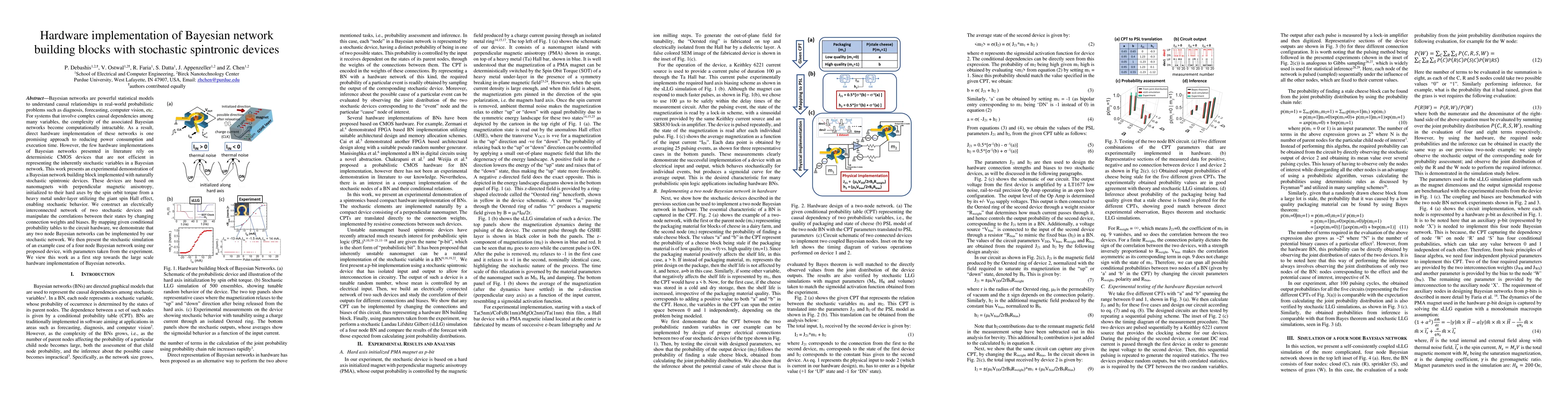 This paper demonstrates a hardware implementation of Bayesian network building blocks using stochastic spintronic devices, which are more efficient for representing stochastic variables compared to traditional CMOS devices. The authors construct an interconnected network of two stochastic devices and show that it can implement any two-node Bayesian network by mapping conditional probability tables to the hardware.