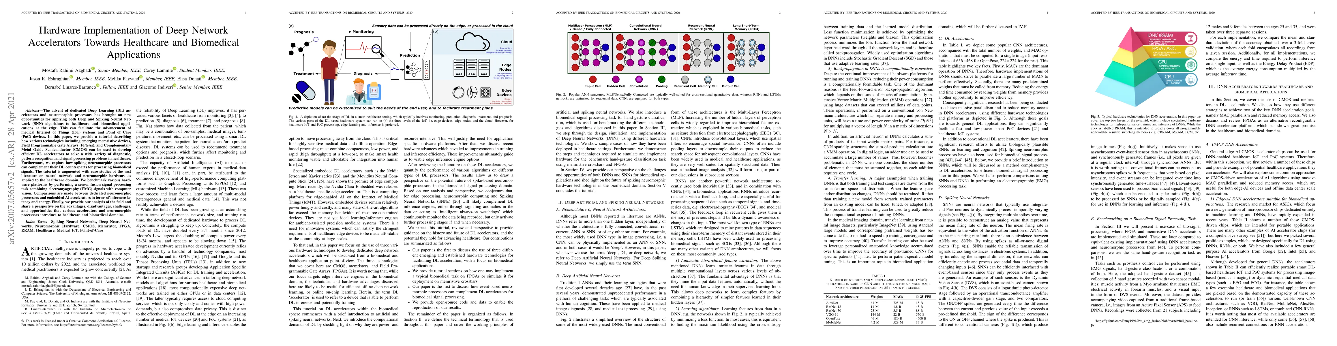 This paper provides a tutorial on implementing deep network accelerators using technologies like FPGAs and CMOS for healthcare applications, highlighting the use of memristive devices and spiking neuromorphic processors. It benchmarks hardware platforms for signal processing tasks, comparing neuromorphic processors and AI accelerators in terms of latency and energy efficiency.