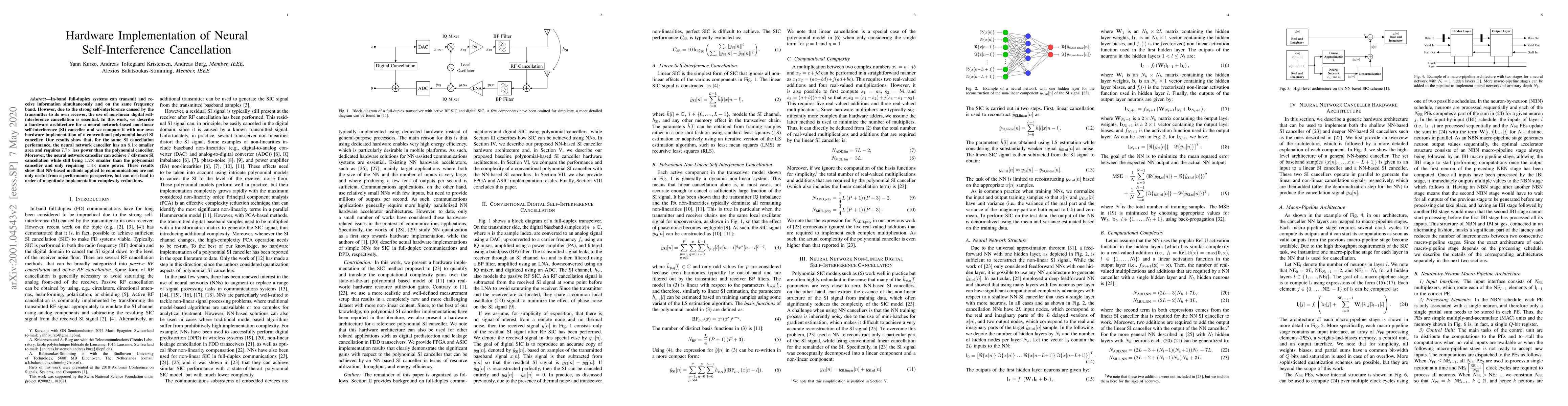 This paper presents a hardware architecture for neural network-based self-interference cancellation in in-band full-duplex systems, comparing it to a conventional polynomial-based canceller. The deep neural network canceller achieves superior hardware and energy efficiency, demonstrating the effectiveness of neural methods in reducing implementation complexity.