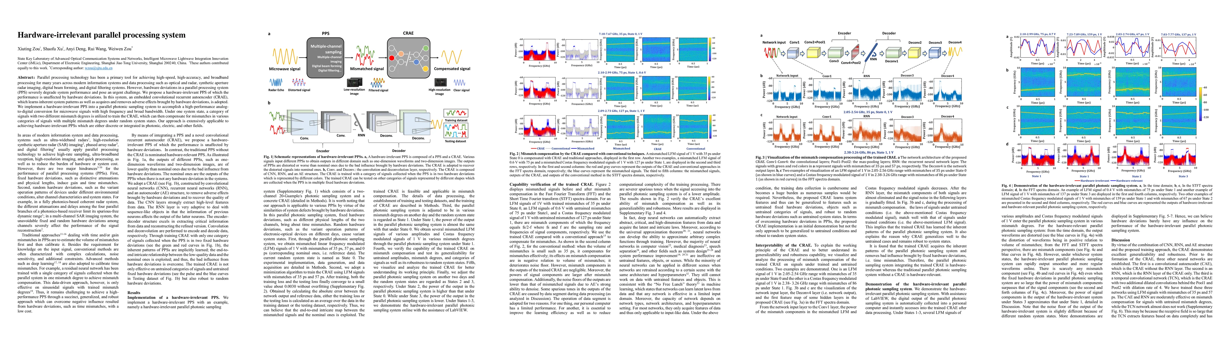 This paper proposes a hardware-irrelevant parallel processing system (PPS) that maintains performance despite hardware deviations. It utilizes an embedded convolutional recurrent autoencoder (CRAE) to learn system patterns and compensate for hardware mismatches, demonstrated through a parallel photonic sampling system for high-frequency microwave signal conversion.
