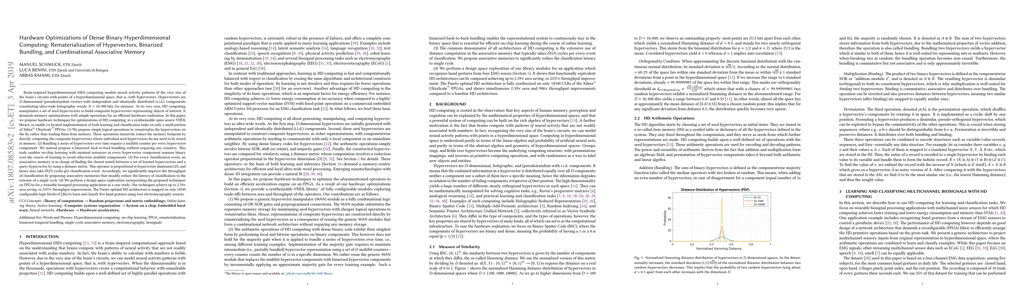 This paper proposes hardware optimizations for dense binary hyperdimensional (HD) computing, including techniques for rematerializing hypervectors on the fly, binarized bundling of hypervectors, and a combinational associative memory. These optimizations aim to reduce memory footprint and resource usage, enabling efficient FPGA-based implementation of HD computing tasks.