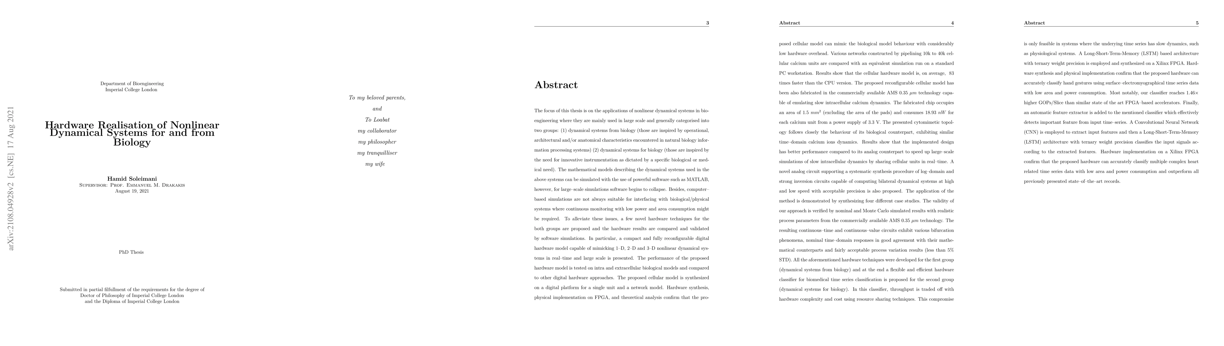 The focus of this thesis is on the applications of nonlinear dynamical systems in bioengineering which are mainly used in large-scale and generally categorised into two groups: (1) dynamical systems from biology (2) dynamical systems for biology. The mathematical models describing the dynamical systems used in the above systems can be simulated with the use of powerful software such as MATLAB, however, for large-scale simulations software begins to collapse. Besides, computer-based simulations are not always suitable for interfacing with biological/physical systems where continuous monitoring with low power and area consumption might be required. To alleviate these issues, a few novel hardware techniques for both aforementioned groups are proposed and their hardware results compared and validated by software simulations.