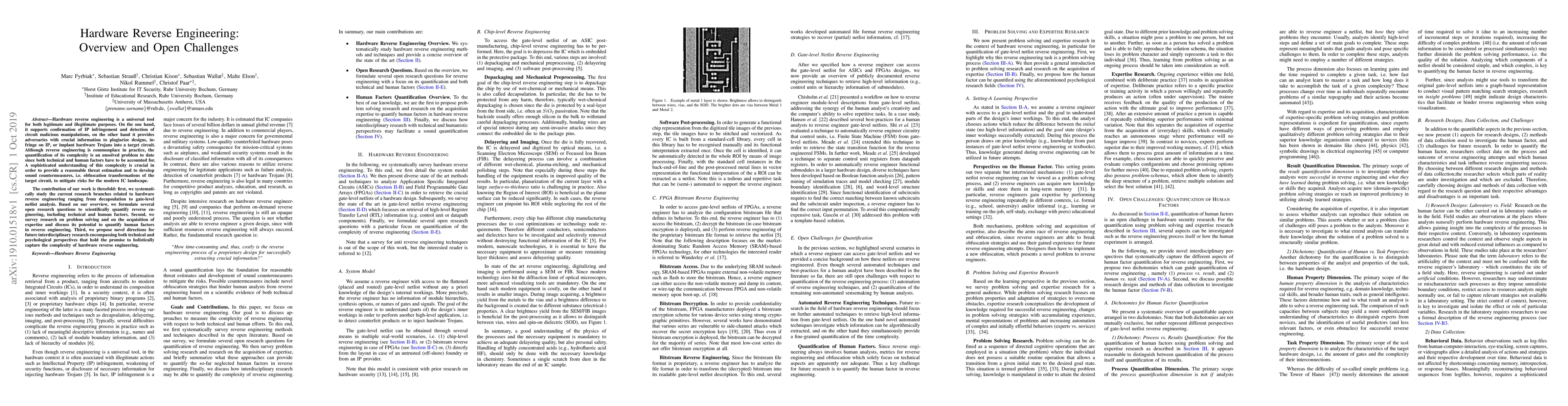 Hardware reverse engineering is a universal tool for both legitimate and illegitimate purposes. On the one hand, it supports confirmation of IP infringement and detection of circuit malicious manipulations, on the other hand it provides adversaries with crucial information to plagiarize designs, infringe on IP, or implant hardware Trojans into a target circuit. Although reverse engineering is commonplace in practice, the quantification of its complexity is an unsolved problem to date since both technical and human factors have to be accounted for. A sophisticated understanding of this complexity is crucial in order to provide a reasonable threat estimation and to develop sound countermeasures, i.e. obfuscation transformations of the target circuit, to mitigate risks for the modern IC landscape. The contribution of our work is threefold: first, we systematically study the current research branches related to hardware reverse engineering ranging from decapsulation to gate-level netlist analysis. Based on our overview, we formulate several open research questions to scientifically quantify reverse engineering, including technical and human factors. Second, we survey research on problem solving and on the acquisition of expertise and discuss its potential to quantify human factors in reverse engineering. Third, we propose novel directions for future interdisciplinary research encompassing both technical and psychological perspectives that hold the promise to holistically capture the complexity of hardware reverse engineering.