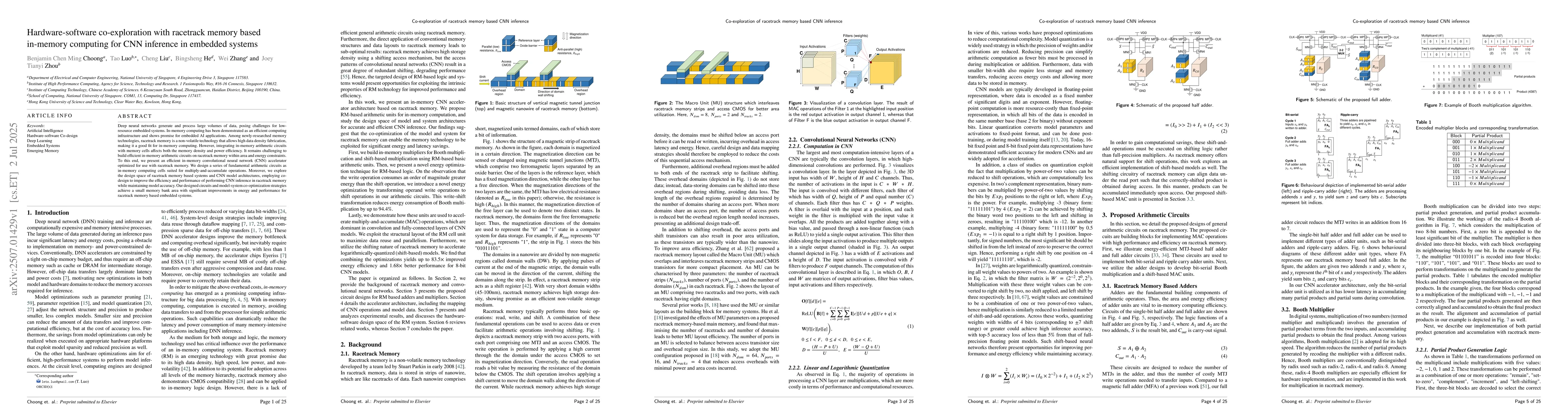 Deep neural networks generate and process large volumes of data, posing challenges for low-resource embedded systems. In-memory computing has been demonstrated as an efficient computing infrastructure and shows promise for embedded AI applications. Among newly-researched memory technologies, racetrack memory is a non-volatile technology that allows high data density fabrication, making it a good fit for in-memory computing. However, integrating in-memory arithmetic circuits with memory cells affects both the memory density and power efficiency. It remains challenging to build efficient in-memory arithmetic circuits on racetrack memory within area and energy constraints. To this end, we present an efficient in-memory convolutional neural network (CNN) accelerator optimized for use with racetrack memory. We design a series of fundamental arithmetic circuits as in-memory computing cells suited for multiply-and-accumulate operations. Moreover, we explore the design space of racetrack memory based systems and CNN model architectures, employing co-design to improve the efficiency and performance of performing CNN inference in racetrack memory while maintaining model accuracy. Our designed circuits and model-system co-optimization strategies achieve a small memory bank area with significant improvements in energy and performance for racetrack memory based embedded systems.