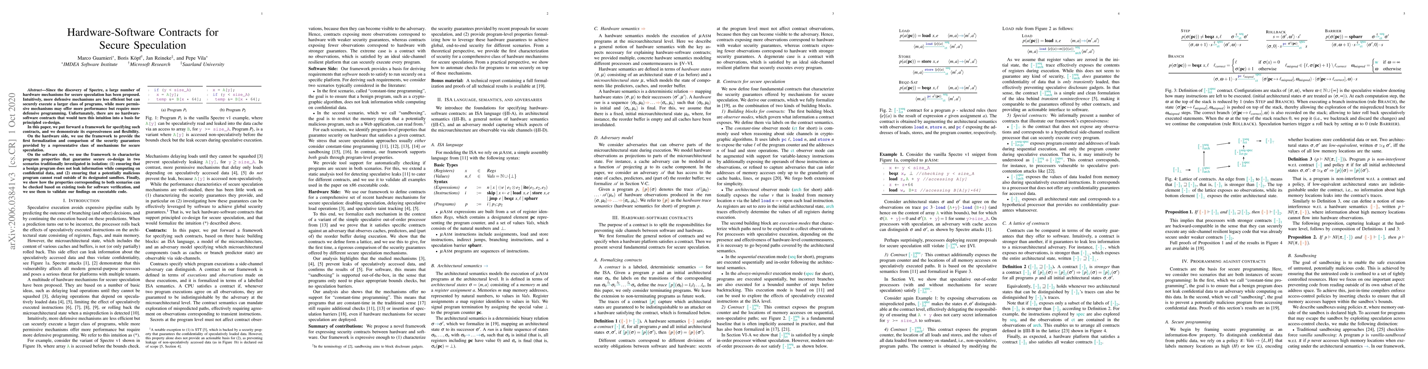 This paper proposes a framework for hardware-software contracts to enable secure speculation, formalizing security guarantees of hardware mechanisms and characterizing software properties for secure co-design. It validates the framework through existing software verification tools and demonstrates its application in protecting confidential data and sandboxing potentially malicious programs.